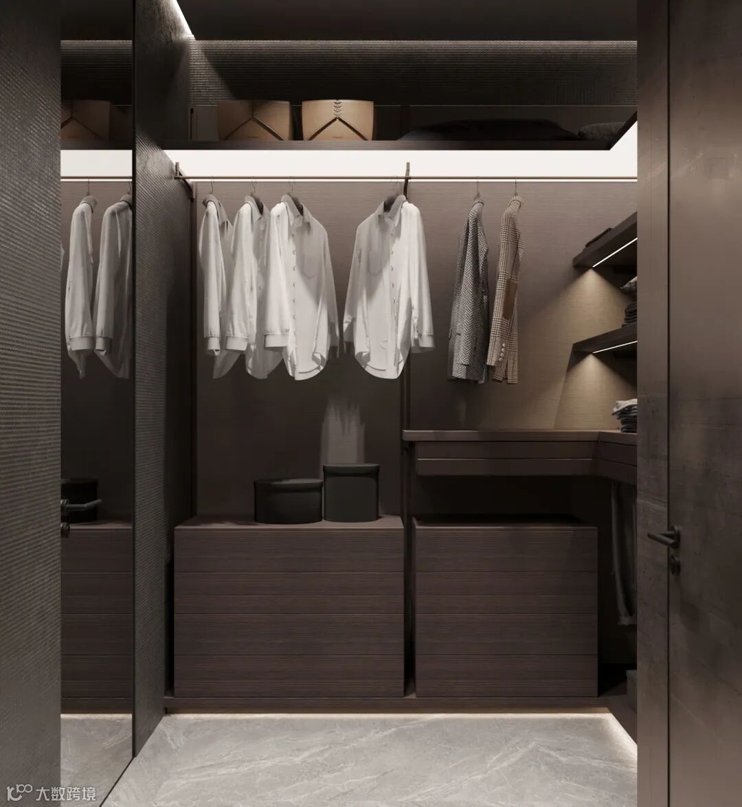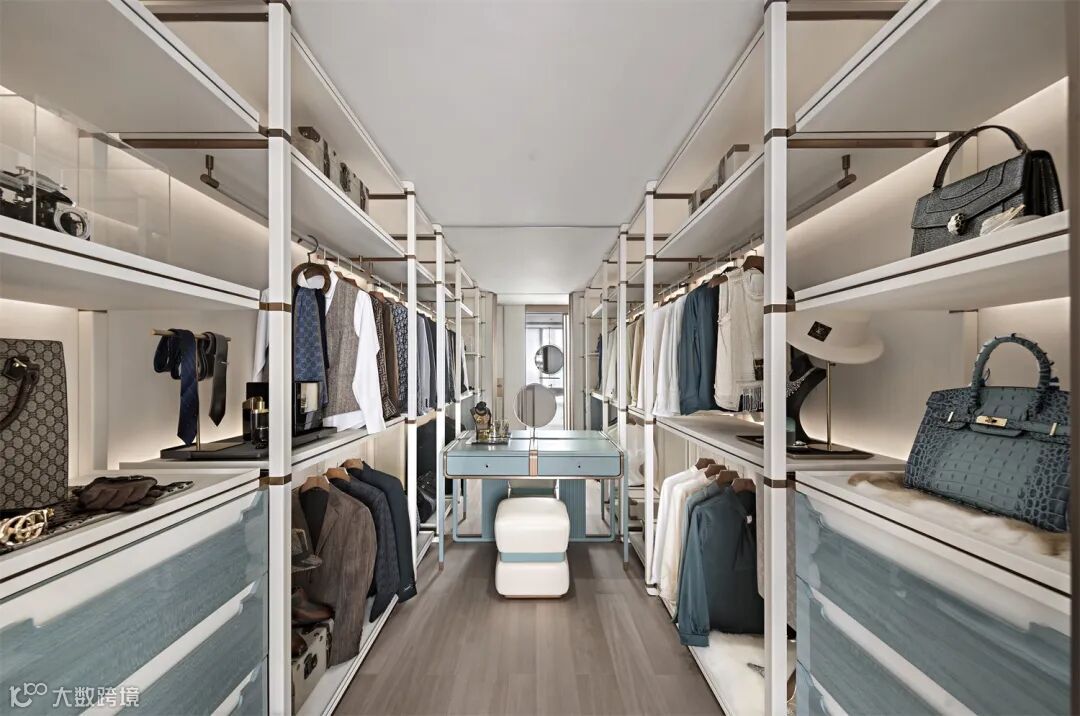 大件区主要用来叠放被褥、毯子、窗帘、软席等,按照日常使用频率来分配的话,它一般位于衣帽间的顶部,并采用分格设计区分开来。