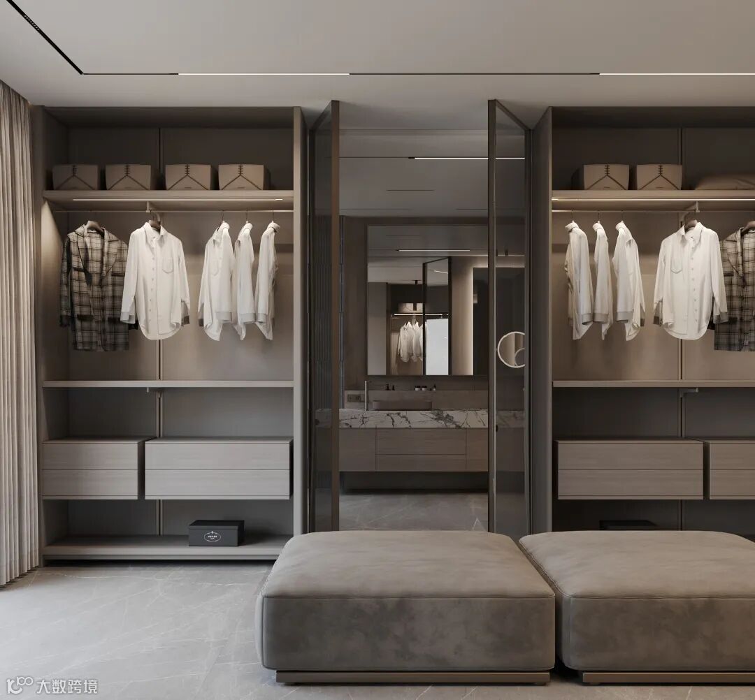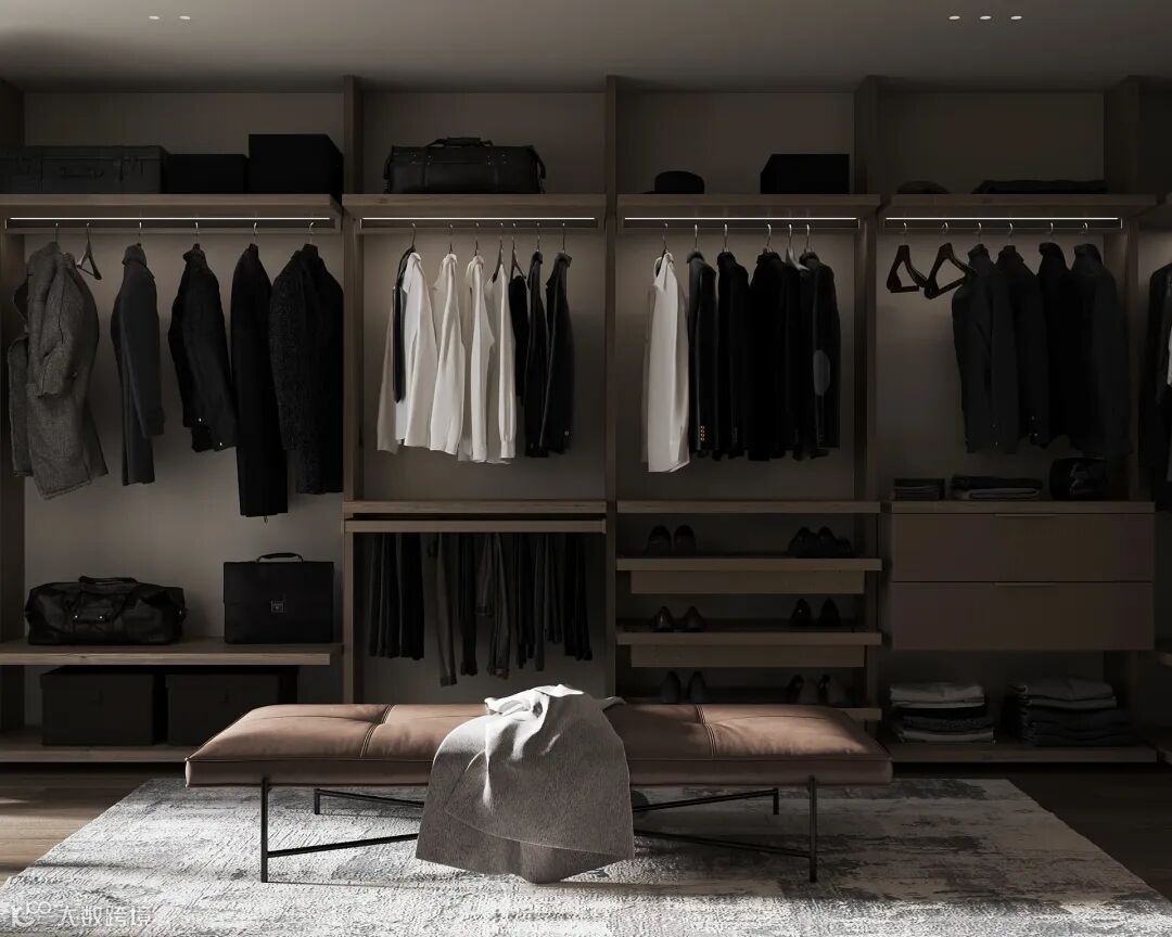 为了提高衣帽间的使用效率,我们应该做好各种功能分类,采用合理的设计来勾勒出悬挂区、叠放区、杂物区和被褥区等专用储藏空间,确保每一寸的空间都充分利用到,这才是衣帽间的正确打开方式。