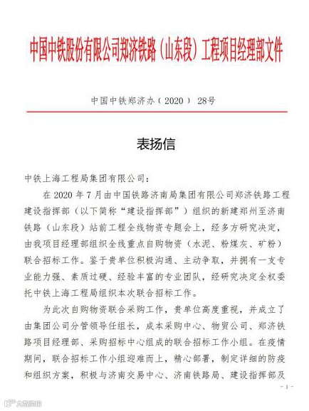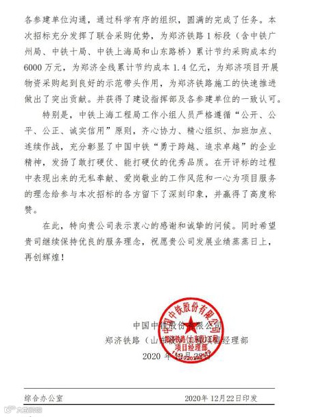 2020年12月22日,股份公司郑济铁路(山东段)工程项目经理部发来表扬信,对集团公司物资采购招标中心表示感谢。信中指出,由上海局集团分管领导任组长,成本采购中心、物贸公司、郑济铁路项目经理部、采购招标中心组成的联合招标工作小组通过精心有效组织,克服疫情影响,圆满完成了招标任务。特别是此次招标充分发挥了联合采购优势,为郑济铁路1标段累计节约采购成本6000万元,为郑济全线累计节约1.4亿元,对郑济铁路施工的快速推进做出了突出贡献。