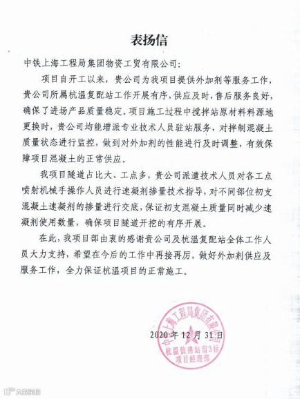 2020年12月31日,杭温铁路站前3标项目经理部发来表扬信,对物贸公司及所属租赁事业部表示感谢。信中指出,物贸公司及租赁事业部为项目提供外加剂等服务以来,工作开展有序、供应及时,售后服务良好,进场产品质量稳定,并且派遣技术人员赴各工点进行技术指导,在保证混凝土质量的同时减少了外加剂使用数量,保证了项目正常施工。