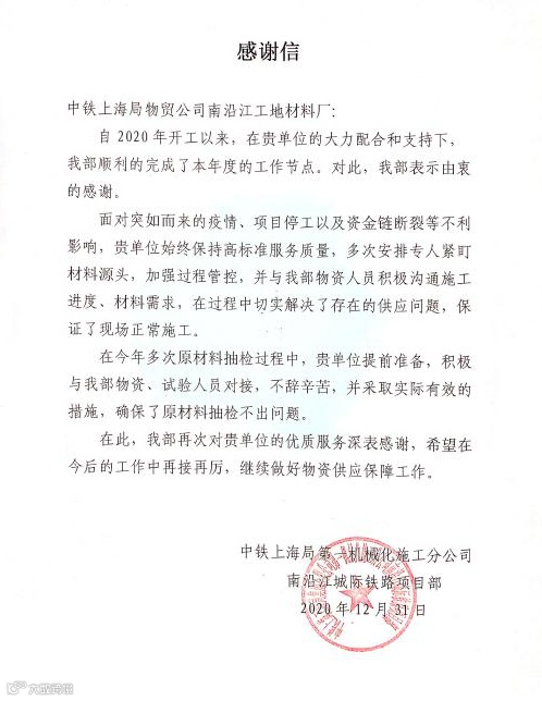 2020年12月31日,南沿江城际铁路项目经理部发来表扬信,对公司及所属南沿江材料厂表示感谢。信中指出,面对2020年的疫情、项目停工、资金链断裂、原材料抽检等困难和挑战,物贸公司及南沿江材料厂始终保持高标准服务质量,多次安排专人紧盯材料源头,加强过程管控,与项目物资人员积极沟通施工进度、材料需求,切实解决了存在的供应问题,保证了现场正常施工。在今年多次原材料抽检过程中,提前做好迎检准备,确保了检测结果合格。