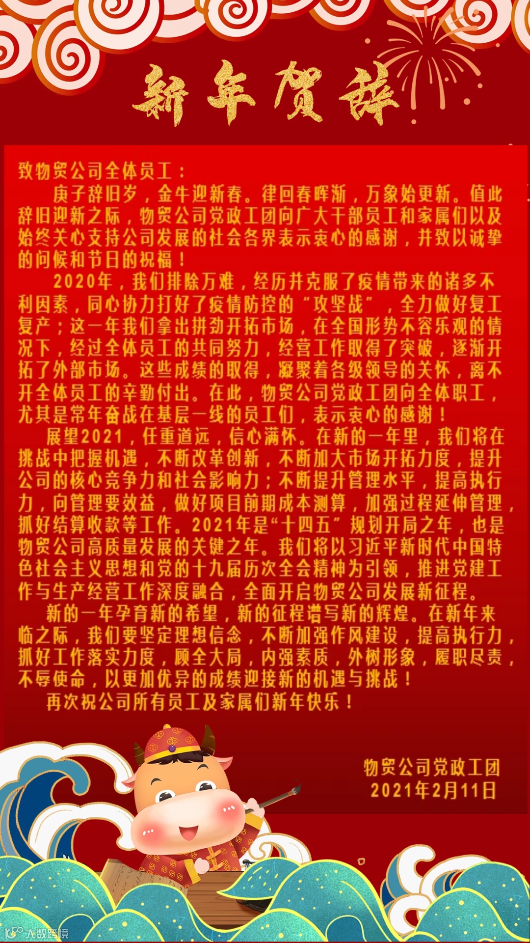 值此新春佳节来临之际,物贸公司向大家送上最真诚的祝福,祝愿大家春节快乐,吉祥安康,幸福美满,万事顺意!