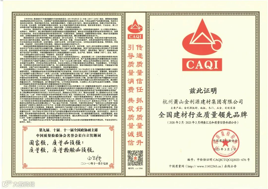 金利源能够在此次活动中获中国质检协会颁发的全国质量检验信得过产品、全国建材行业质量领先品牌、全国产品和服务质量诚信示范企业三项权威认证称号,对于金利源来说,不仅是一种肯定,同时也印证了金利源对于“金品质·源生态”绿色产品理念的坚守。