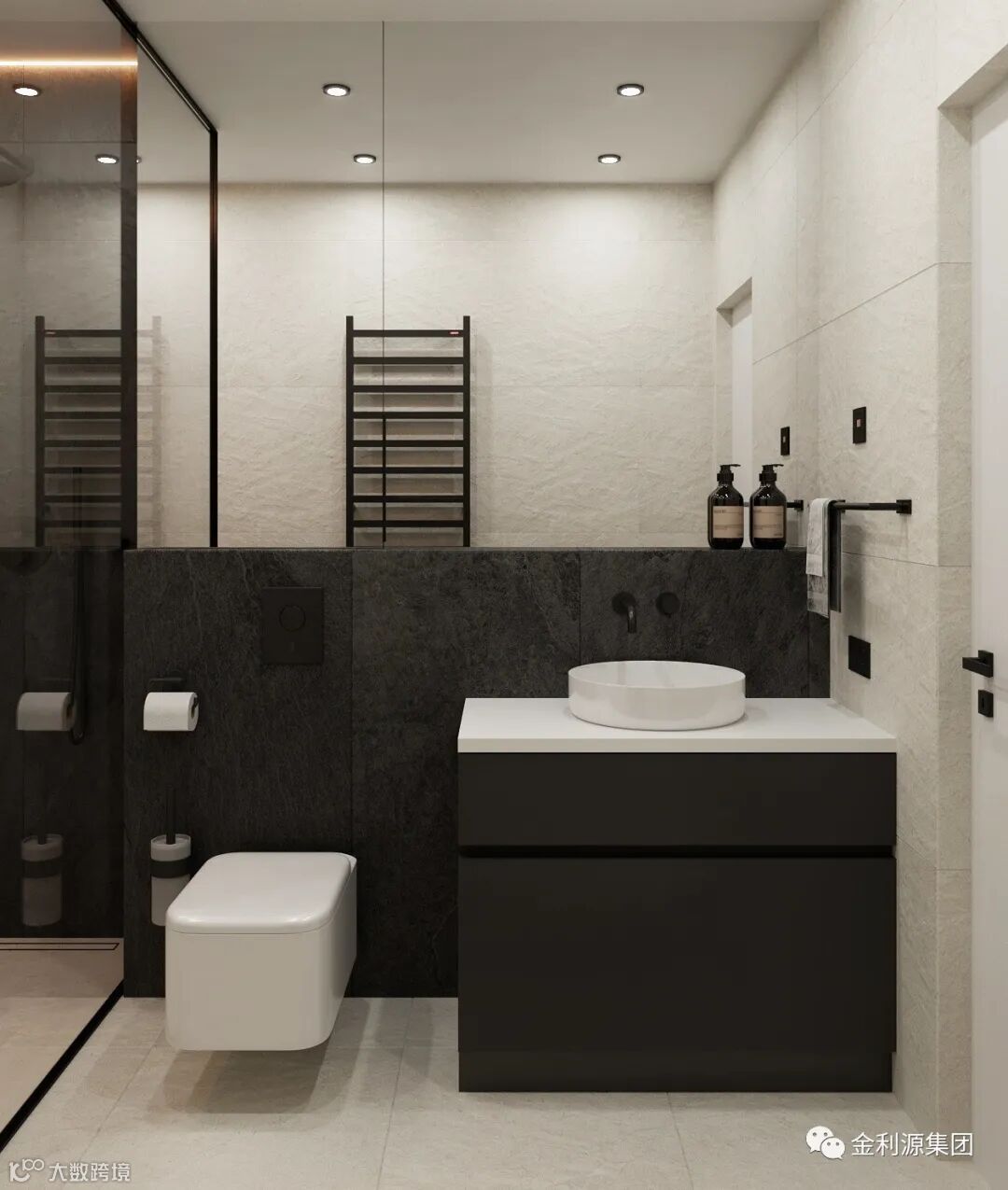 如果你家马桶和盥洗池是并排放置的,不妨将镜柜延伸到马桶上方,增加收纳的同时,还可以让视觉有延伸感,镜柜的反射的效果也会让卫生间看起来更为明亮、宽敞。
