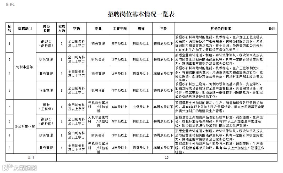 为适应公司自建砂石料厂和外加剂厂业务发展需要,中铁上海局物贸公司拟面向社会公开招聘15名管理人员。