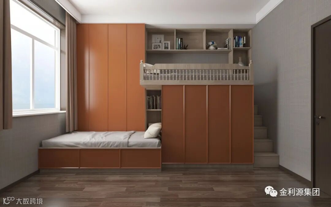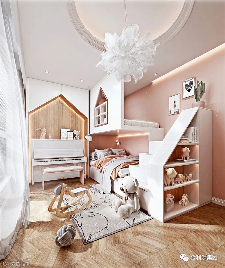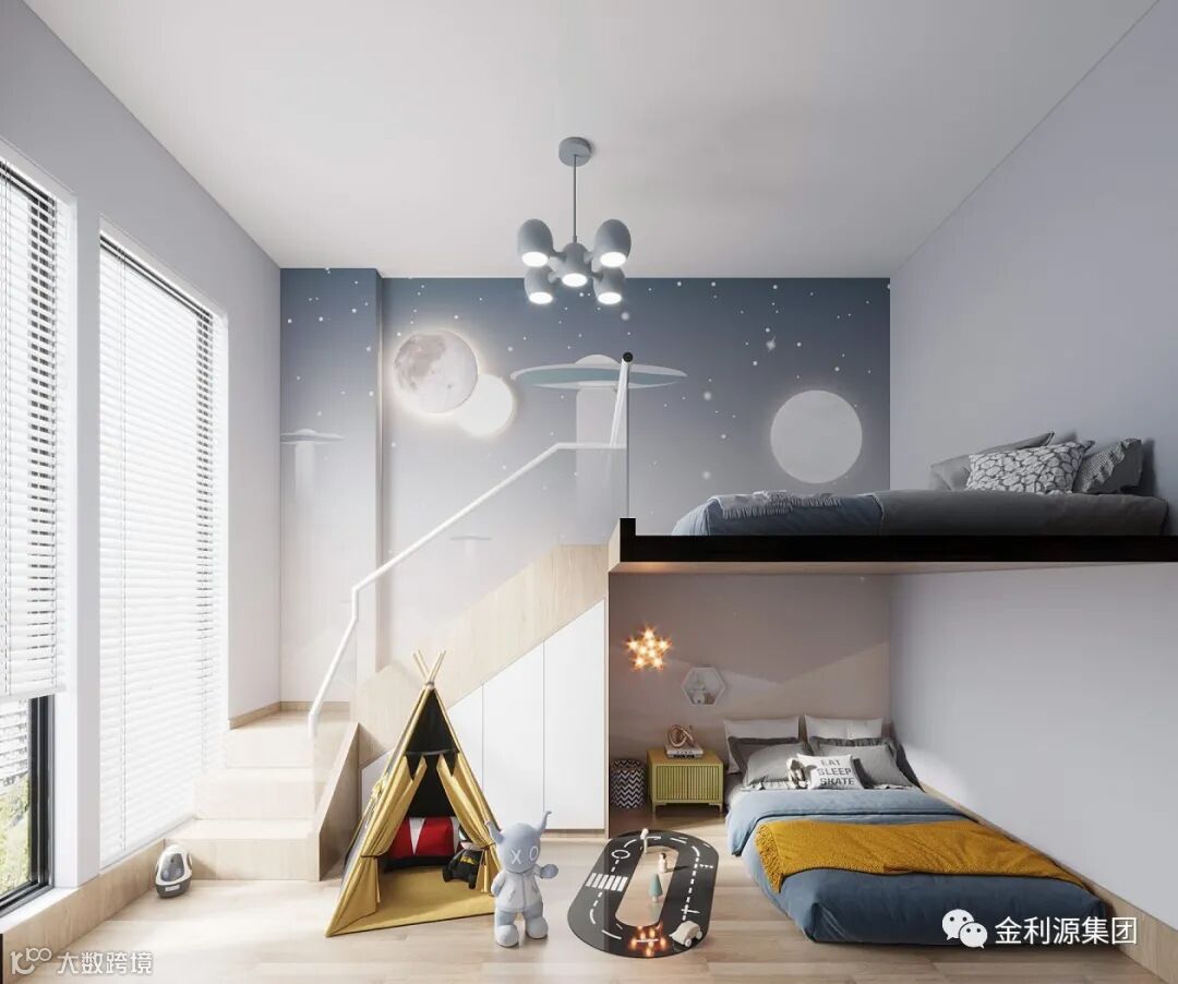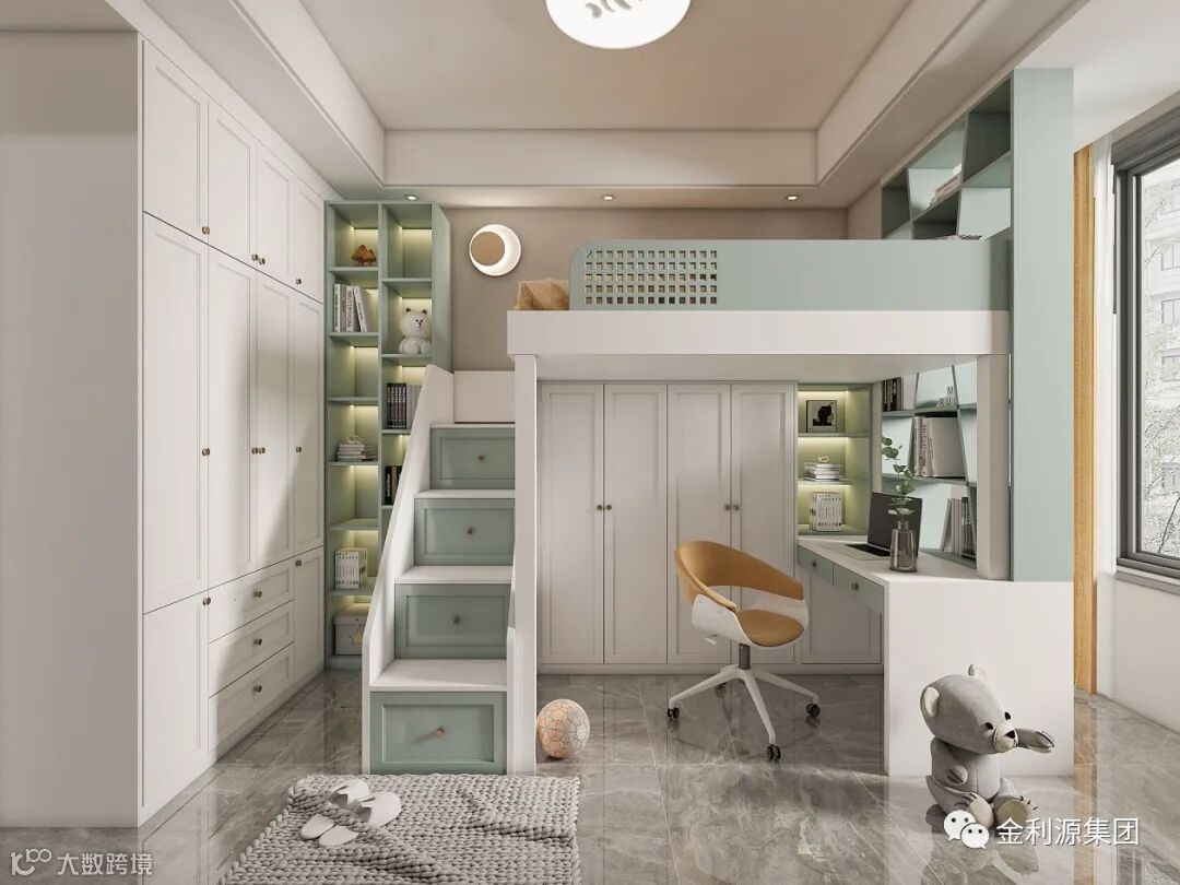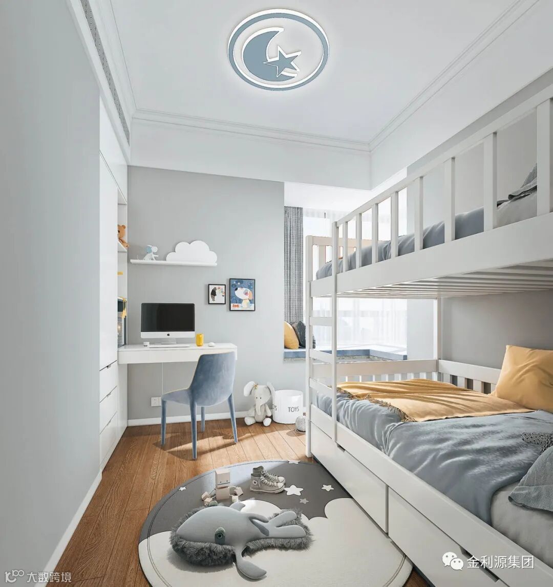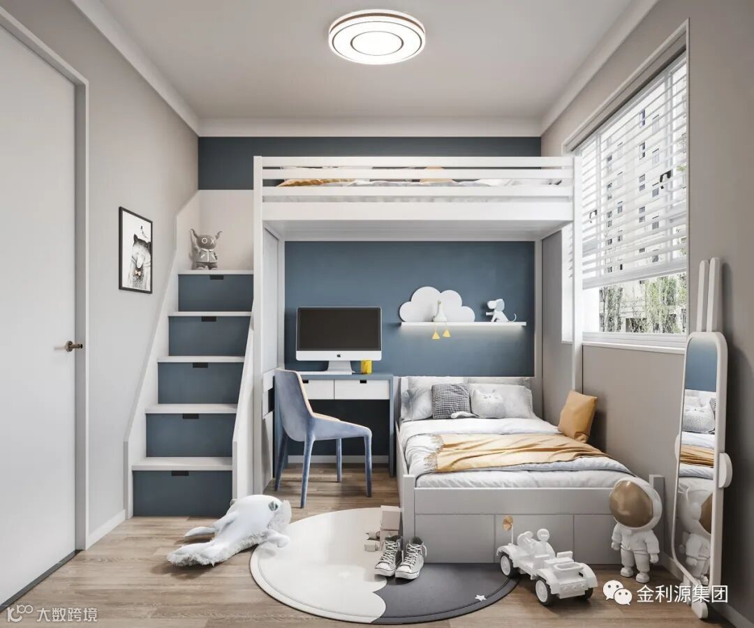 有限的儿童房空间下,摆不下书桌,这样也可以采用“上床下桌”的设计,采用高架床,床底就布置上书桌作为写字作业的空间。