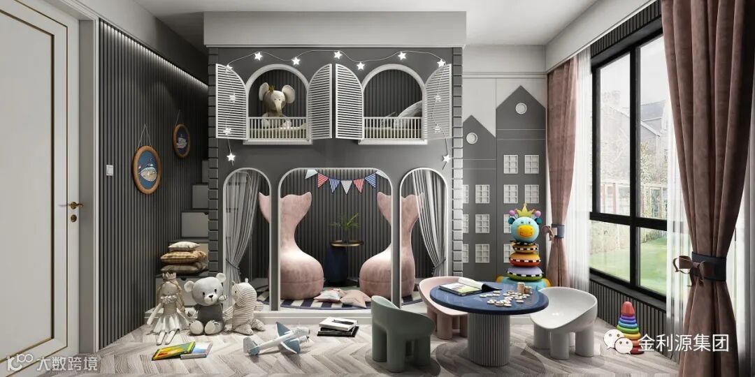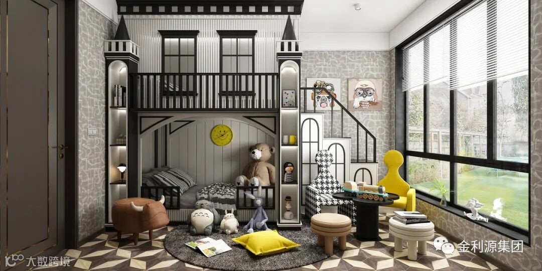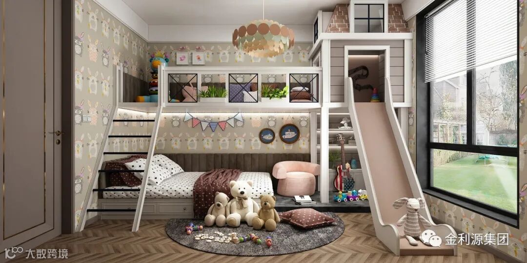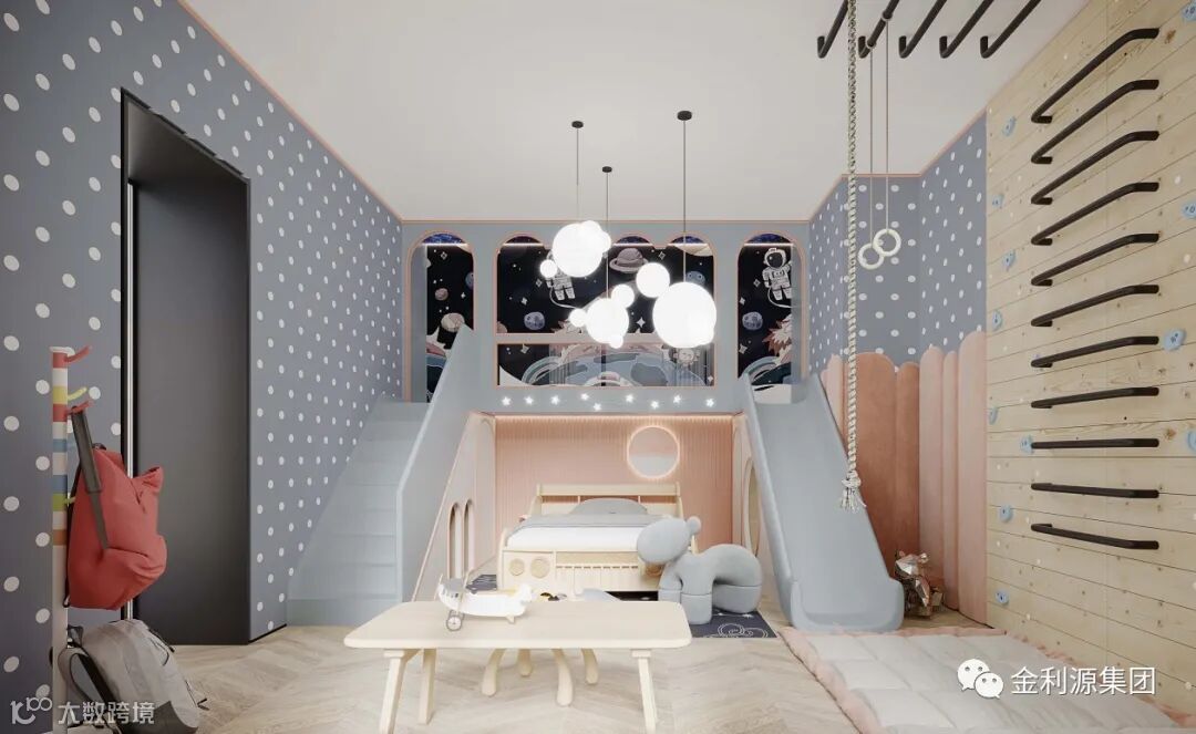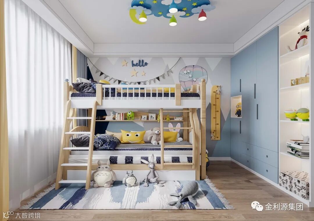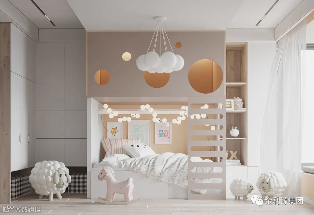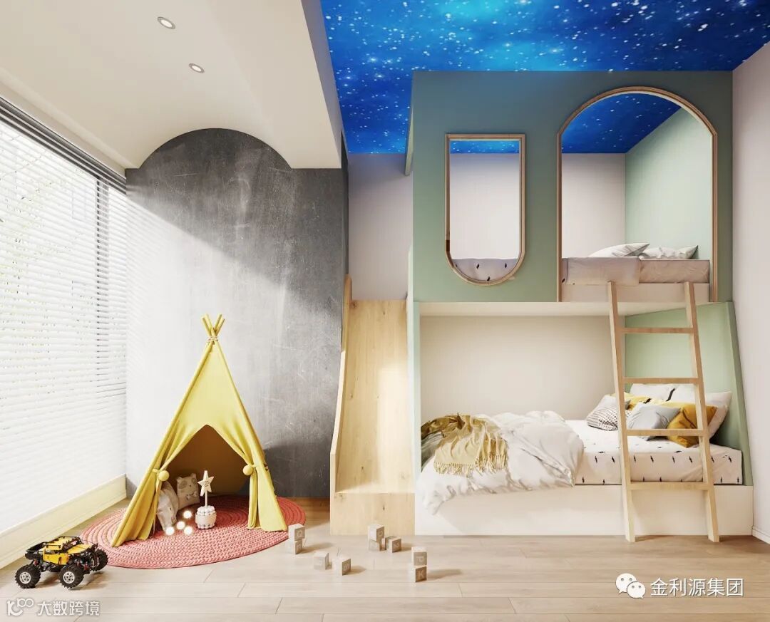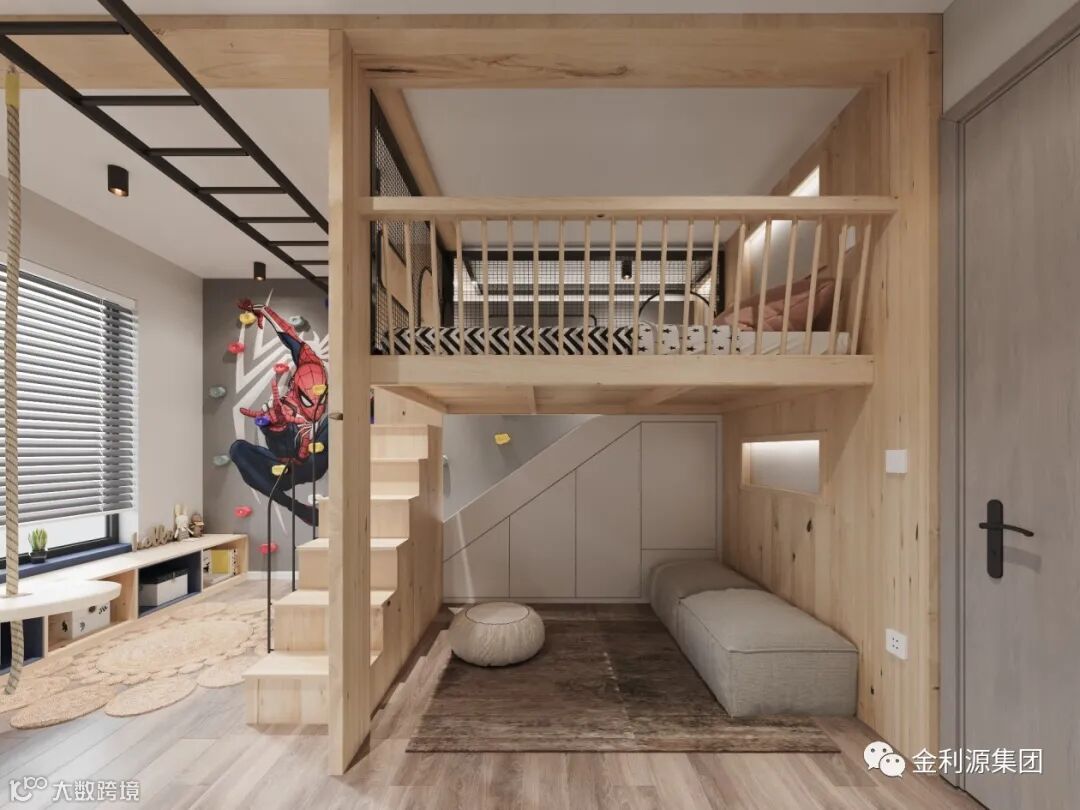 上下床若是可以加点小心思,可以结合上游乐玩耍的功能进去,让儿童房成为孩子在家玩耍的好地方。