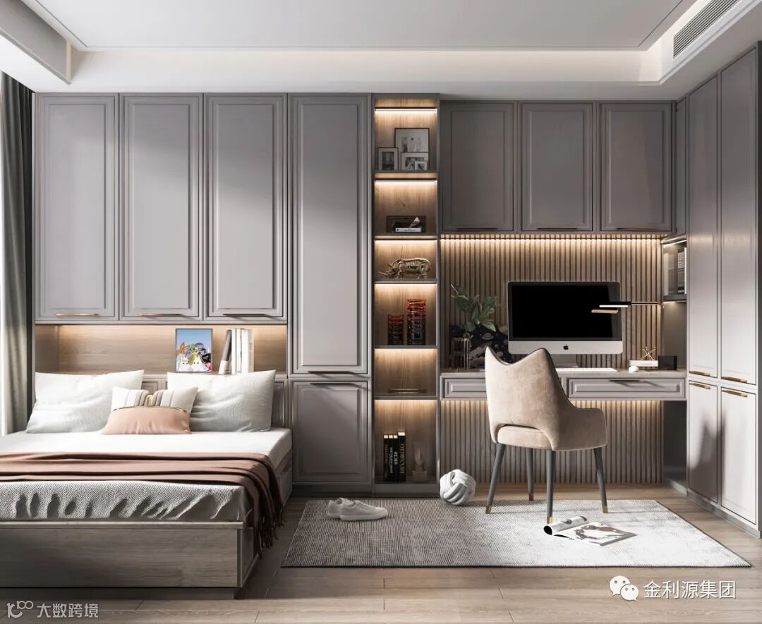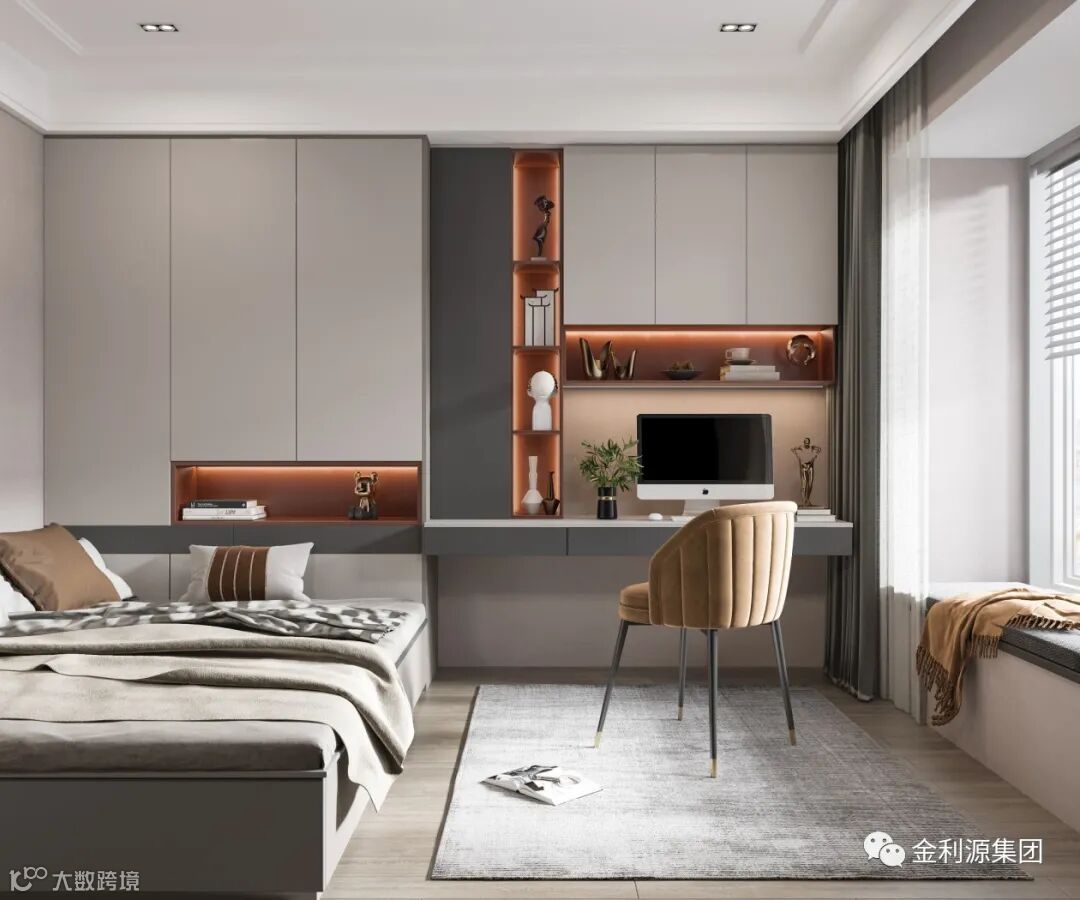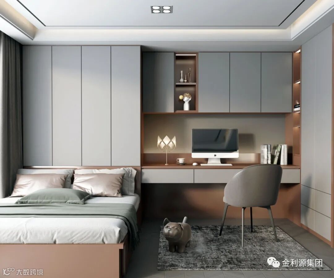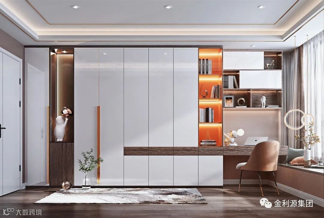 除了衣柜与书柜组合,衣柜与书桌柜组合更是一种不错的组合形式,这样组合便于户主和孩子读书、办公、阅读,非常适合没有独立书房的家庭。