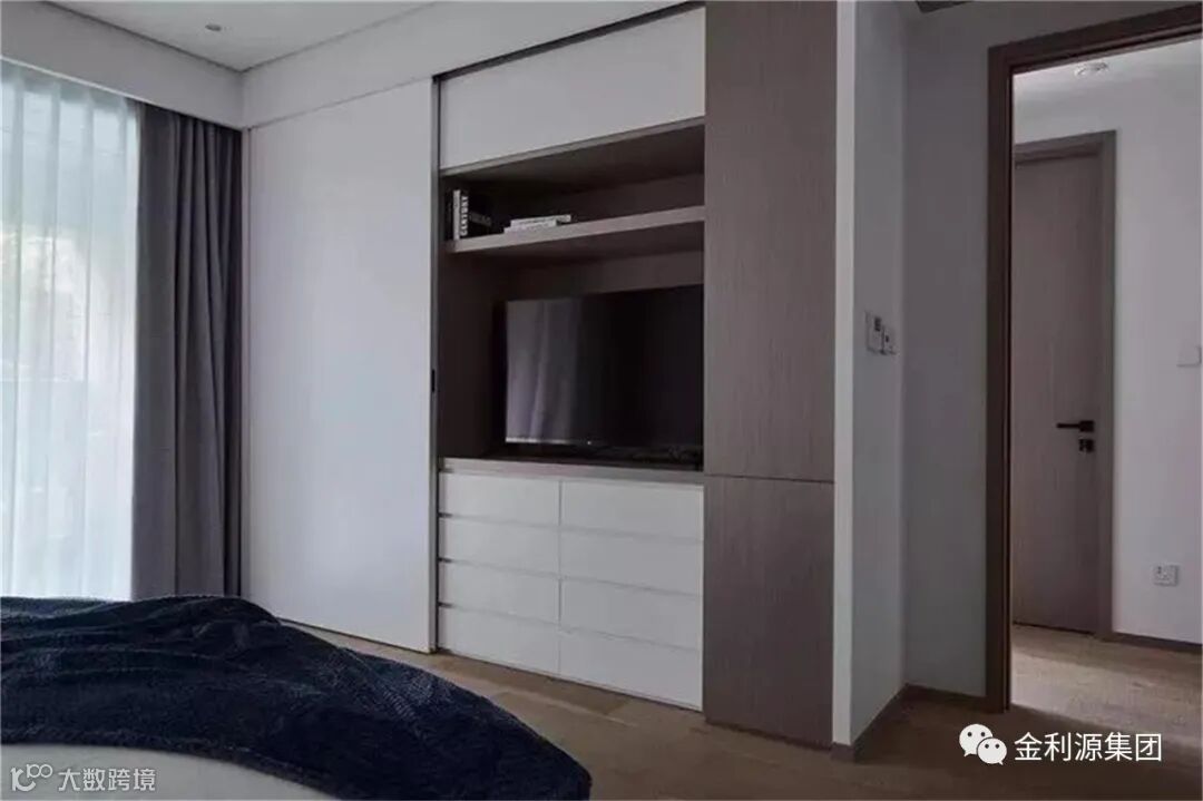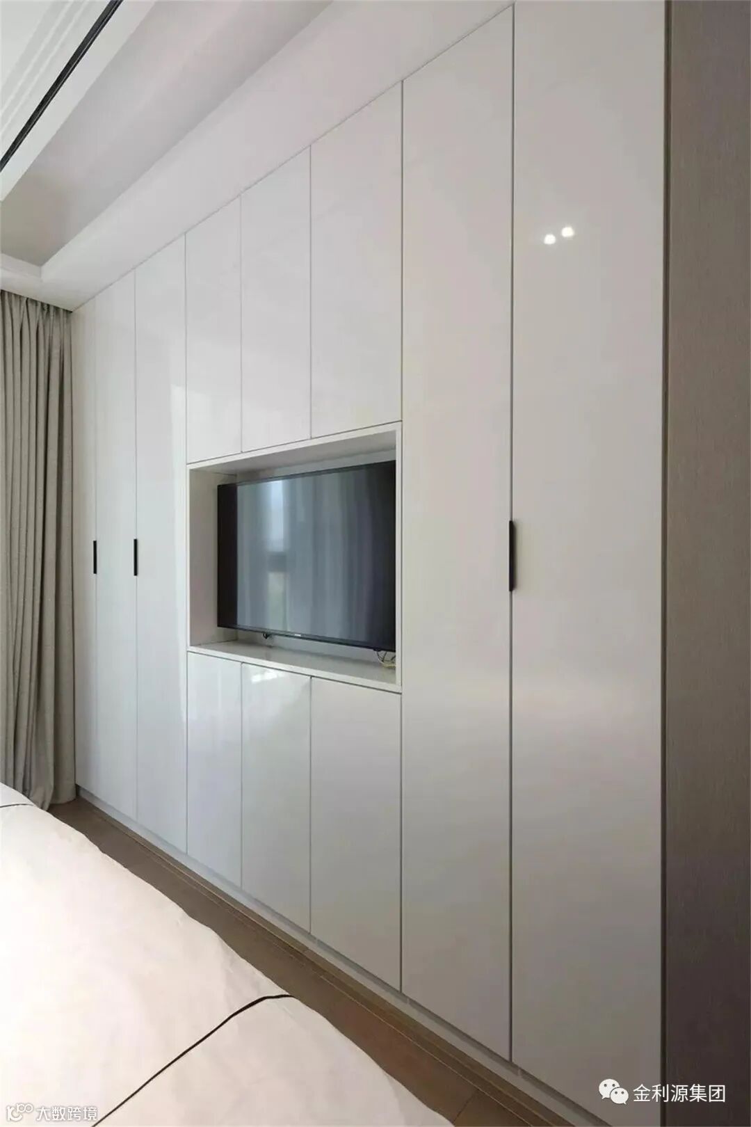 卧室里专门打造一个电视柜很不实用,这时候可以将衣柜和电视柜组合起来,整墙设计成收纳柜,让电视柜内嵌其中,既保持了原来的电视柜功能,又融入了衣柜的设计,简单又美观。