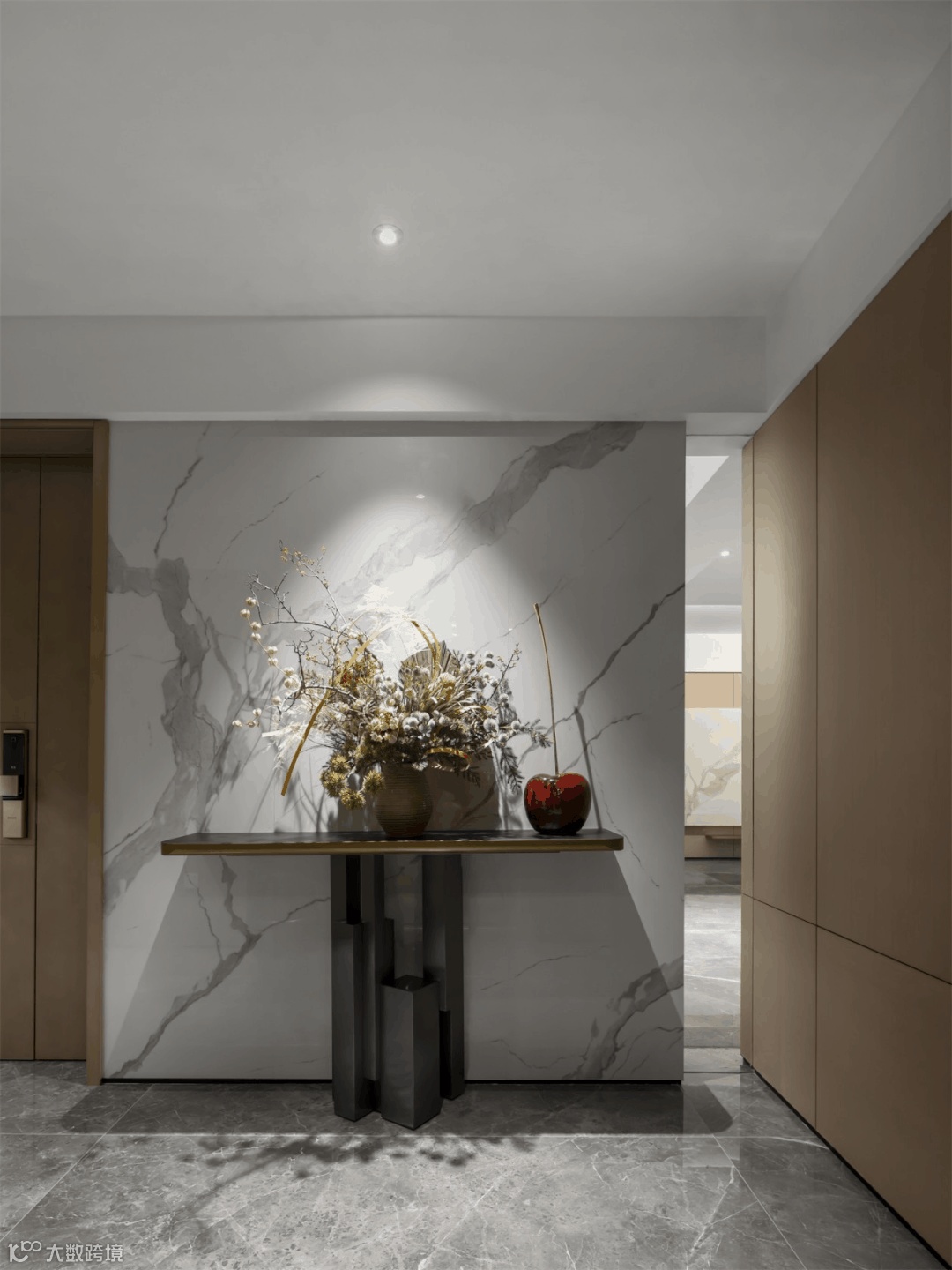 右边是玄关的的大理石背景板,左边是温润的木饰面,两种材质的碰撞,有一种安静儒雅之感。红色的摆件和过道的色调形成鲜明的对比,视觉冲击力更强。