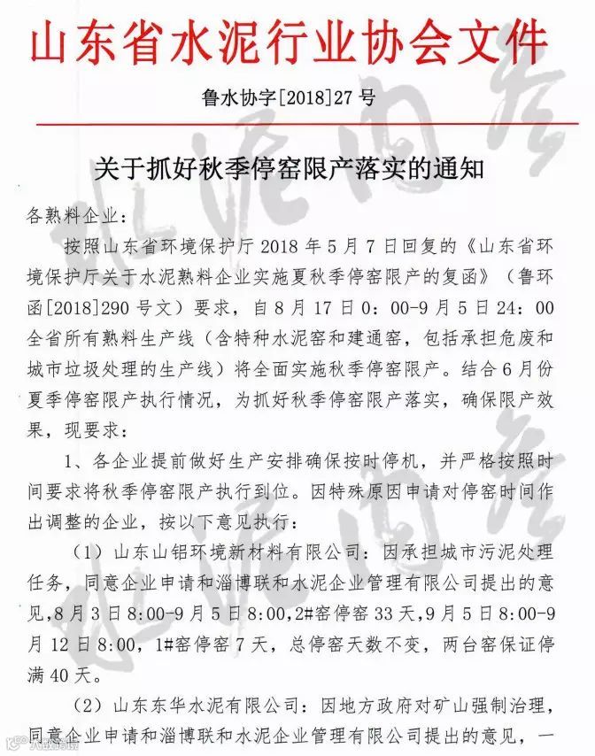 8月中旬,山东省水泥协会下发秋季停窑限产通知,要求山东境内所有水泥熟料生产线停窑一个月。