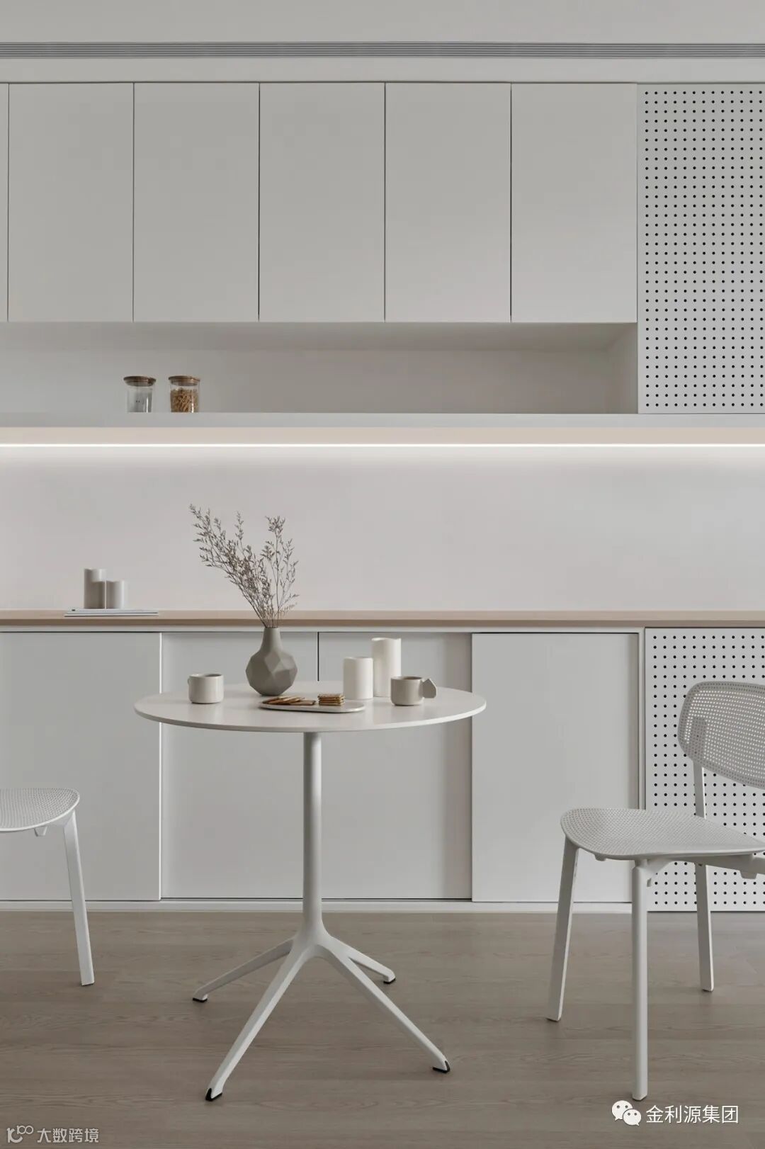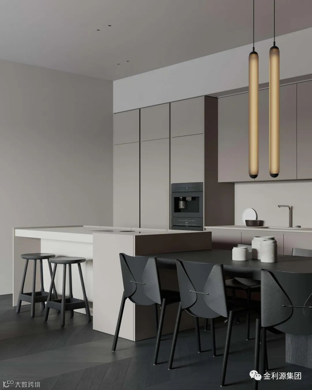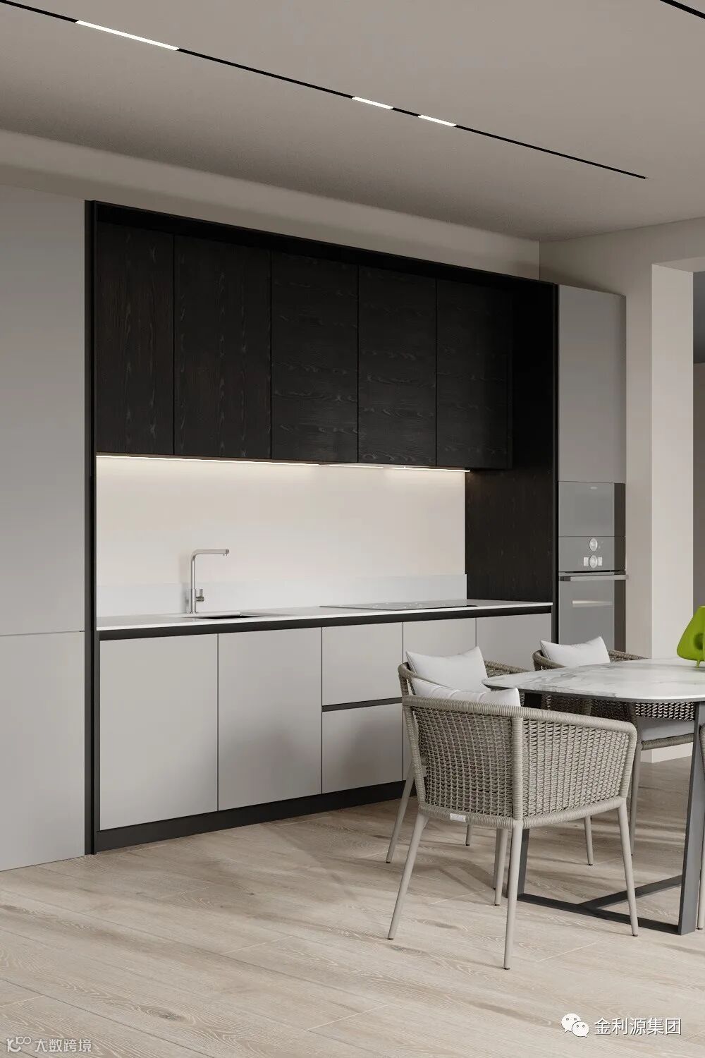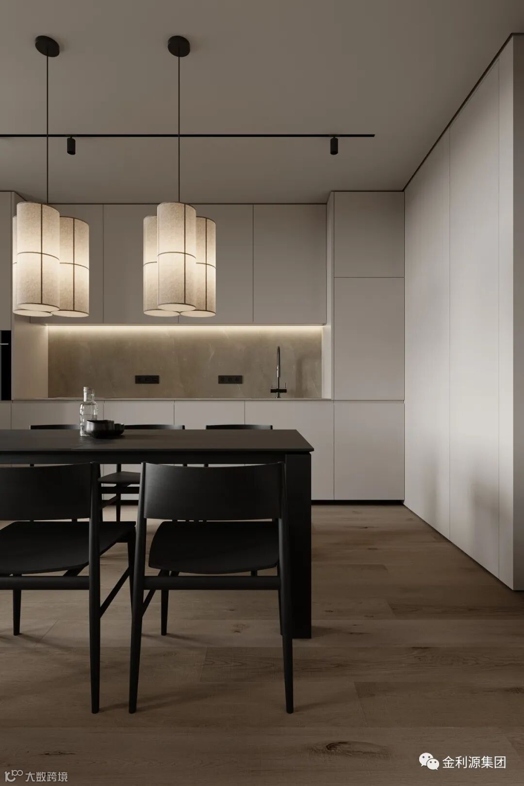 极简餐厨整体的设计,不在墙面,及预想构图上设计,而是以模型为中心的设计规划,空间的整体感强。