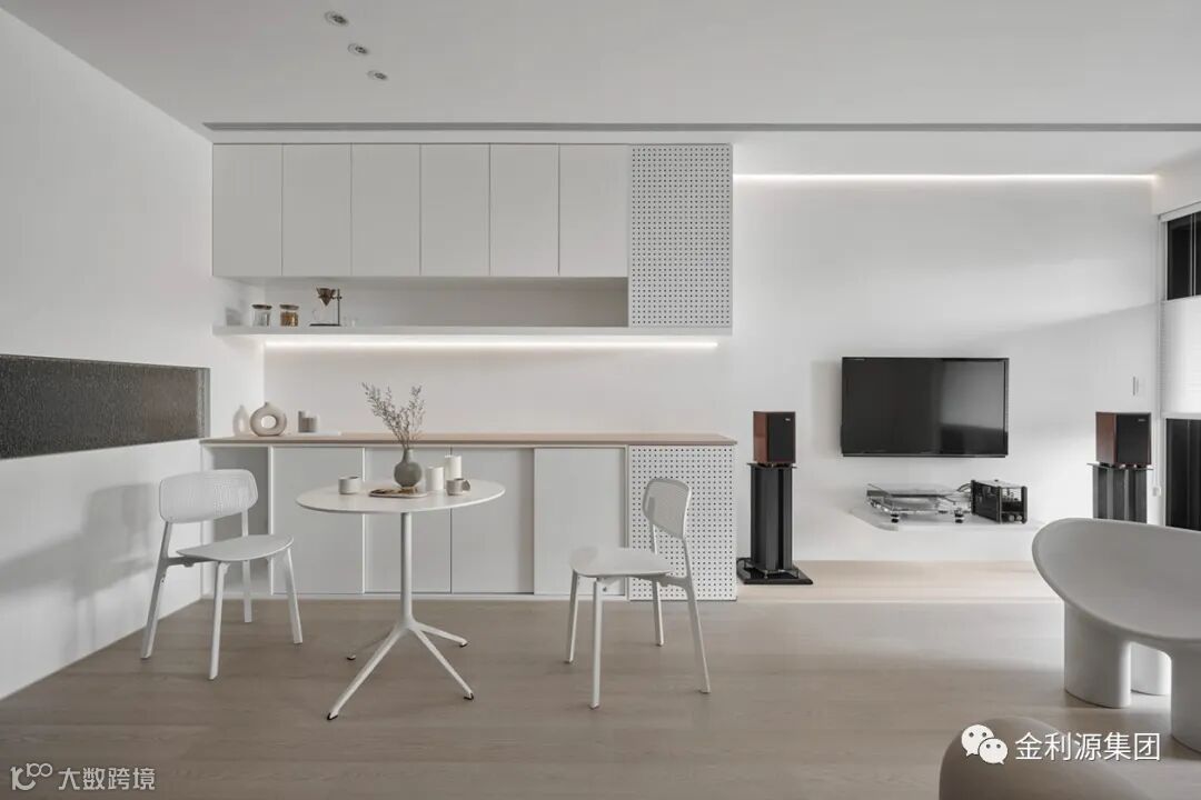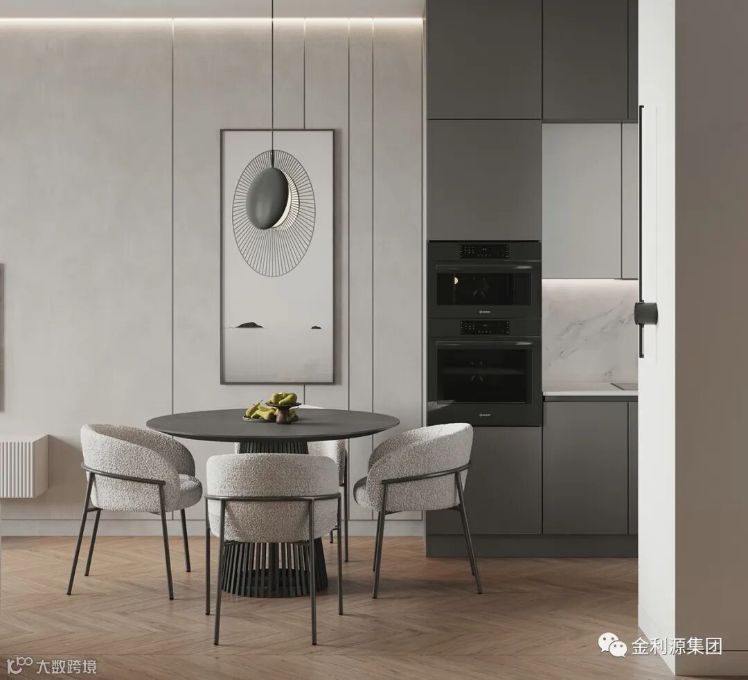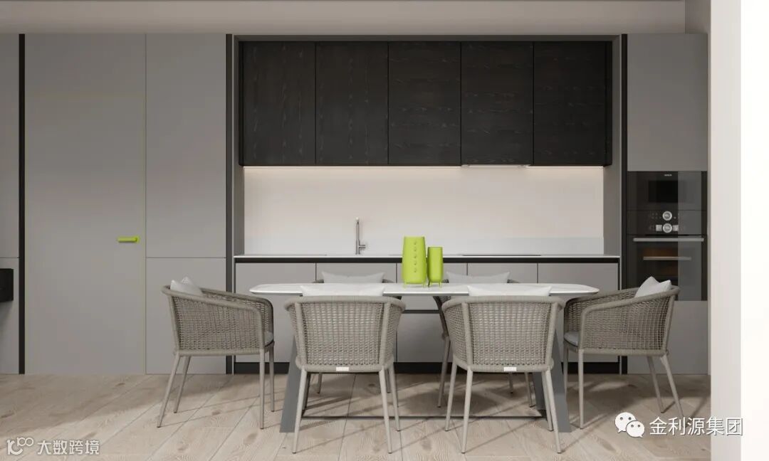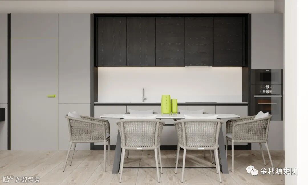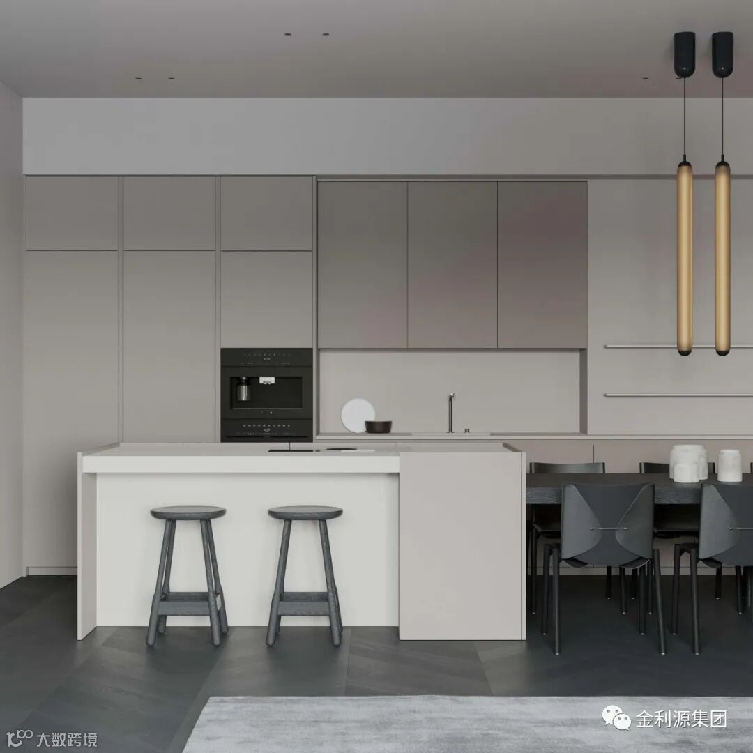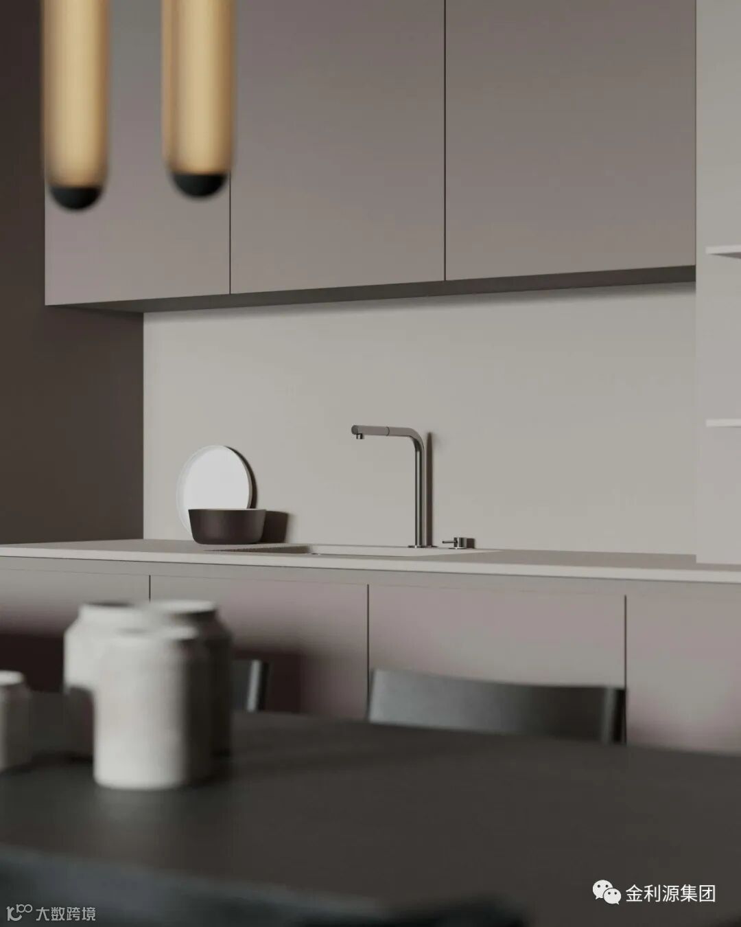 极简餐厨整体的设计,不在墙面,及预想构图上设计,而是以模型为中心的设计规划,空间的整体感强。