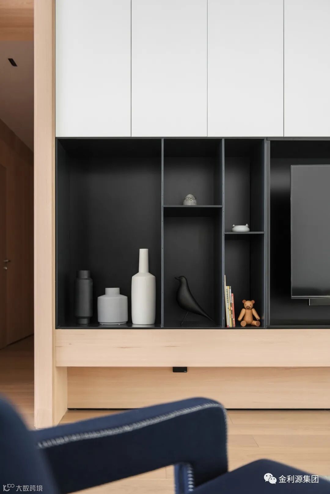 客厅中的入墙式柜子多数以电视柜或者沙发背景墙柜的形式出现,柜子中一般放置能够装点空间的艺术作品。