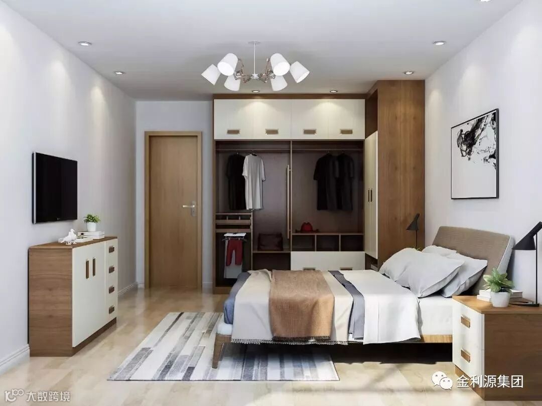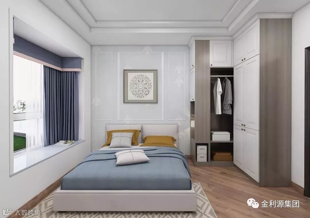 金利源用衣柜遮挡住墙面,使得造型多变,巧妙的变成了一道风景线。转角衣柜很好地将风格统一起来,从转角处延伸至床头墙面,原木色板材简约舒适,整体感也更强!