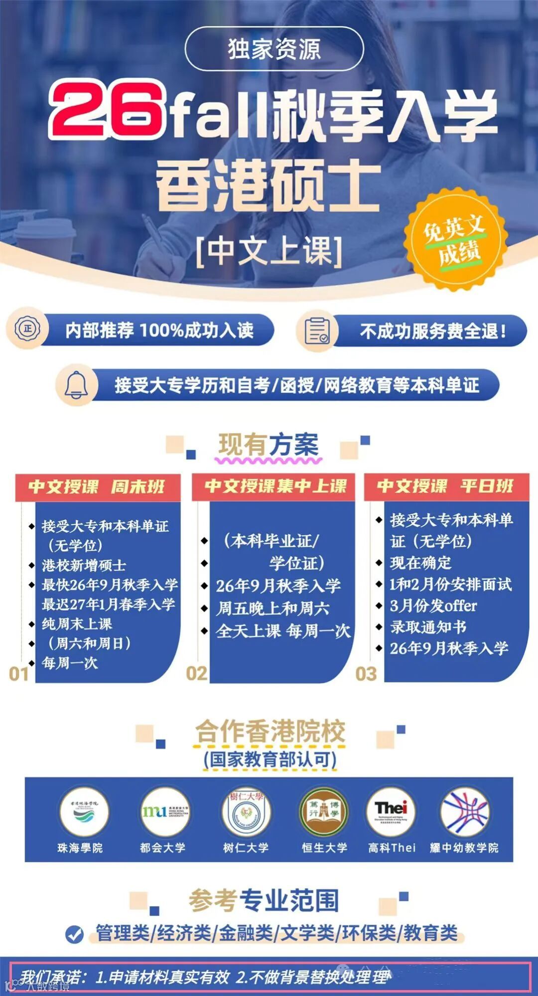 重磅!独家资源 周末班/集中上课!25年9月入学中文授课港硕内部推荐 100%入读。