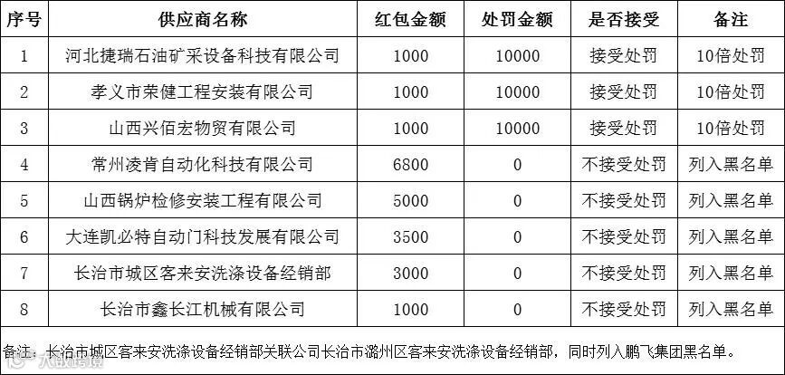 关于鹏飞集团对物资供应商红包行贿的处罚决定