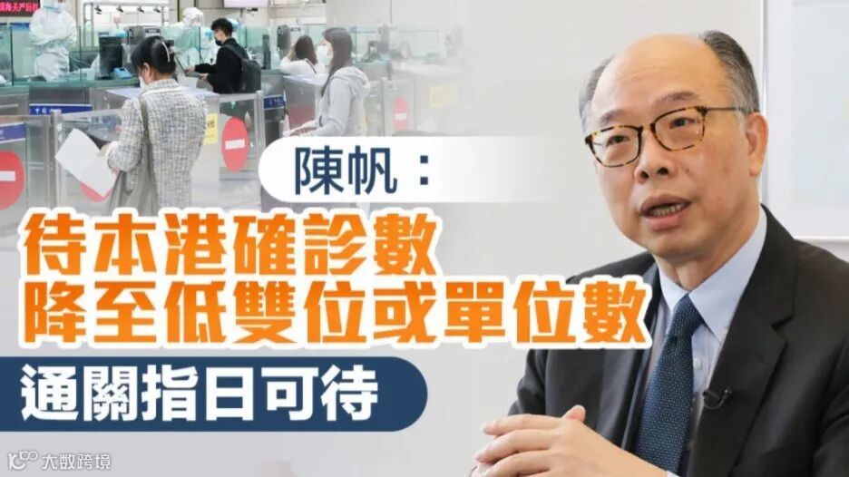 陈帆表示,一直与内地及澳门政府商讨通关事宜,只要疫情受控,通关便是指日可待,「不是需要个确诊数目去到零,因为大家都知道这是个目标,但是并不能够短时间内达致,所以大家都理解,当疫情受控,当香港的感染数目,是接近低双位数,甚或至单位数时,我相信(通关)是指日可待的」。他呼吁,市民应保持社交距离,令疫情得以控制,并指当疫苗供港后,又有较大部分市民已接种,就可助恢复三地通关。