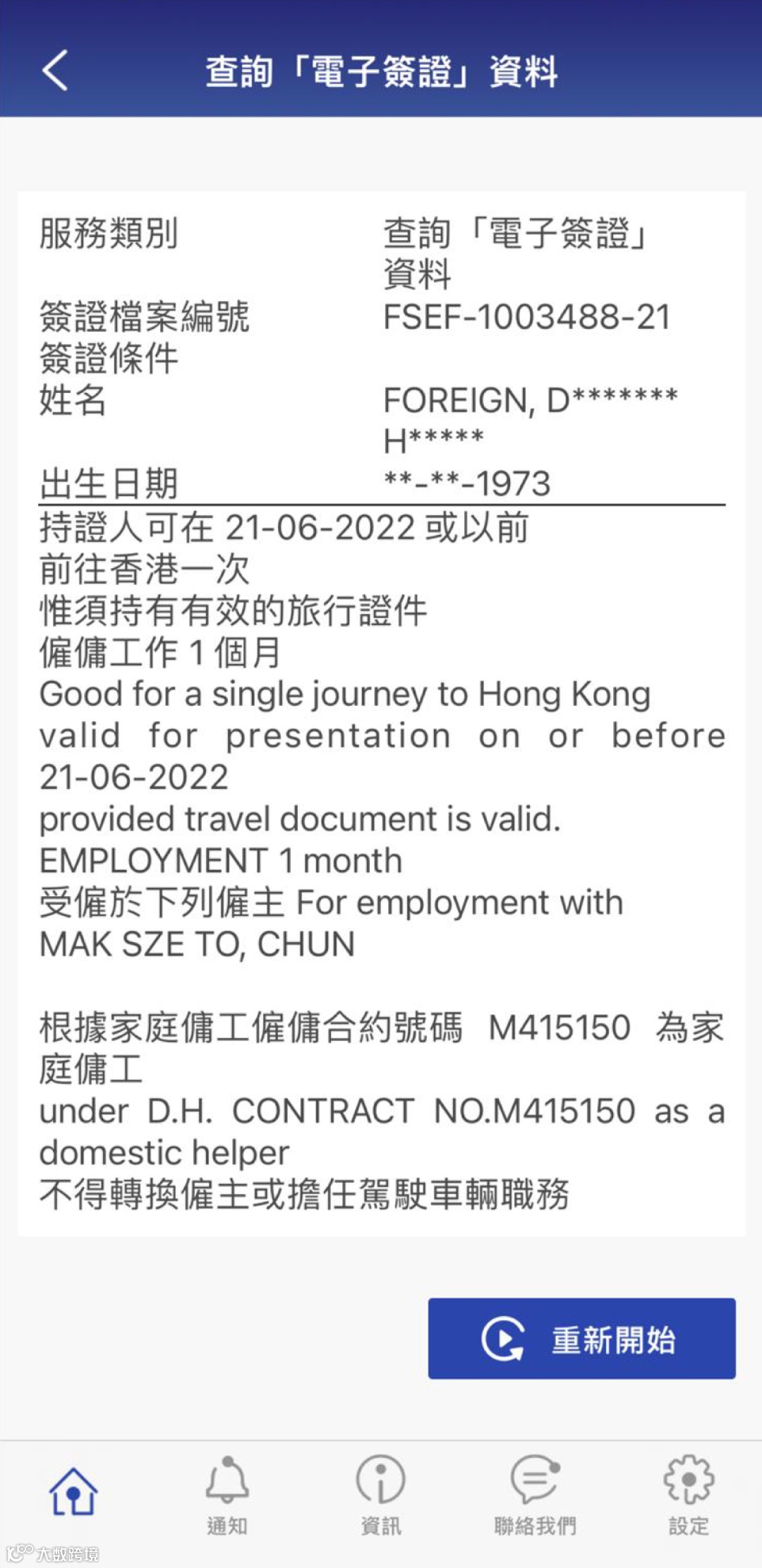 有关人士也可透过入境处流动应用程式、该处网站或香港政府一站通网站的查询电子签证服务,输入电子签证上的资料以作核实。
