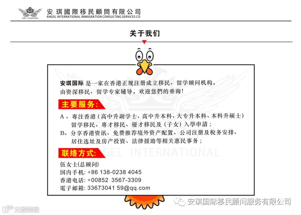 安琪國際人才移民服务:专注内地或国际生办理 香港副学士/大专/本科/硕士/博士升学服务。其次,还提供香港高才、专才、投资移民及优才服務等。另涉入辅助服务:承办各类签证续签服务、商务代理代办、文案翻译及作业辅导专一站式专项服务。