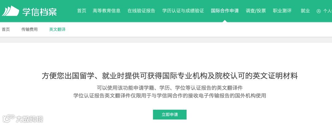点击顶部菜单“国际合作申请”栏目申请学籍、学历在线验证报告的英文翻译件