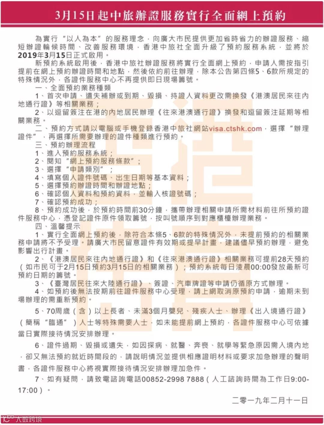 据大公文汇全媒体报道,香港中国旅行社(港中旅)2月11日宣布,为提高办证服务效率,港中旅将于3月15日正式启用新预约系统,对“港澳居民来往内地通行证”(俗称“回乡证”)相关业务等办证服务全面实行网上预约。