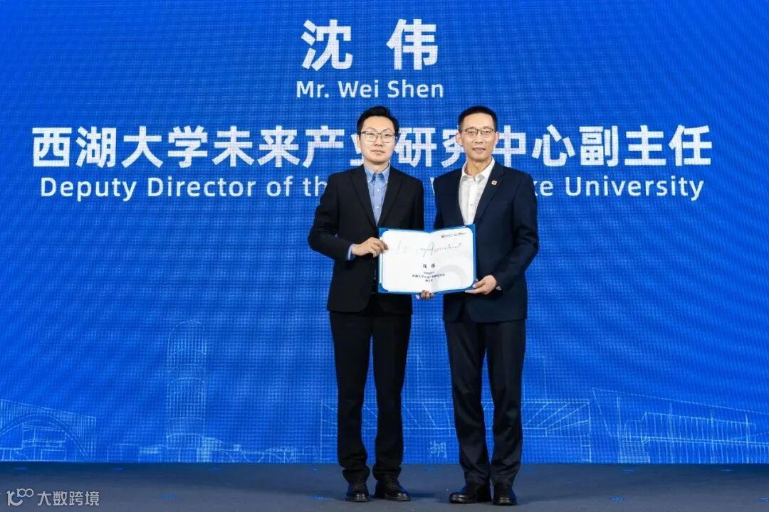 西湖大学校长、西湖大学未来产业研究中心主任施一公为沈伟颁发聘书