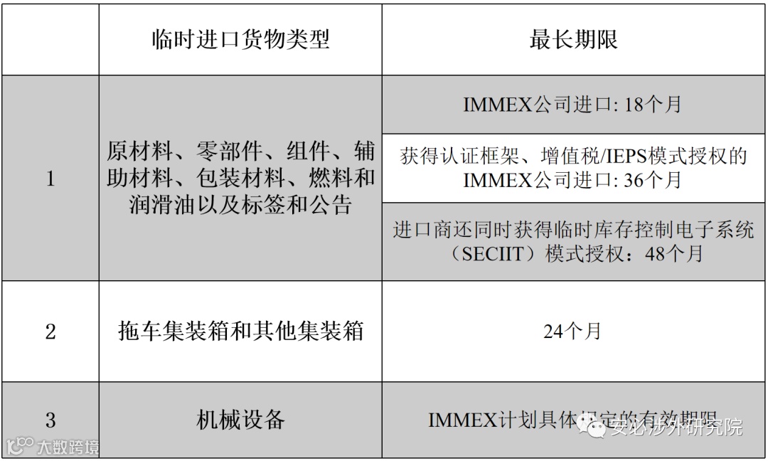 在临时进口的海关制度规定下,临时进口货物可在墨西哥停留的期限如下:
