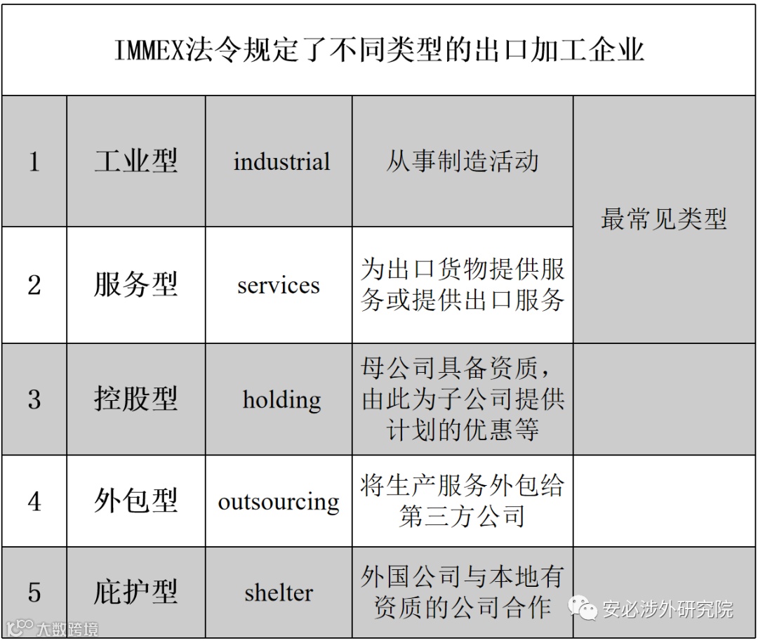 此外,IMMEX法令直接规定了不同类型的出口加工企业,具体如下: