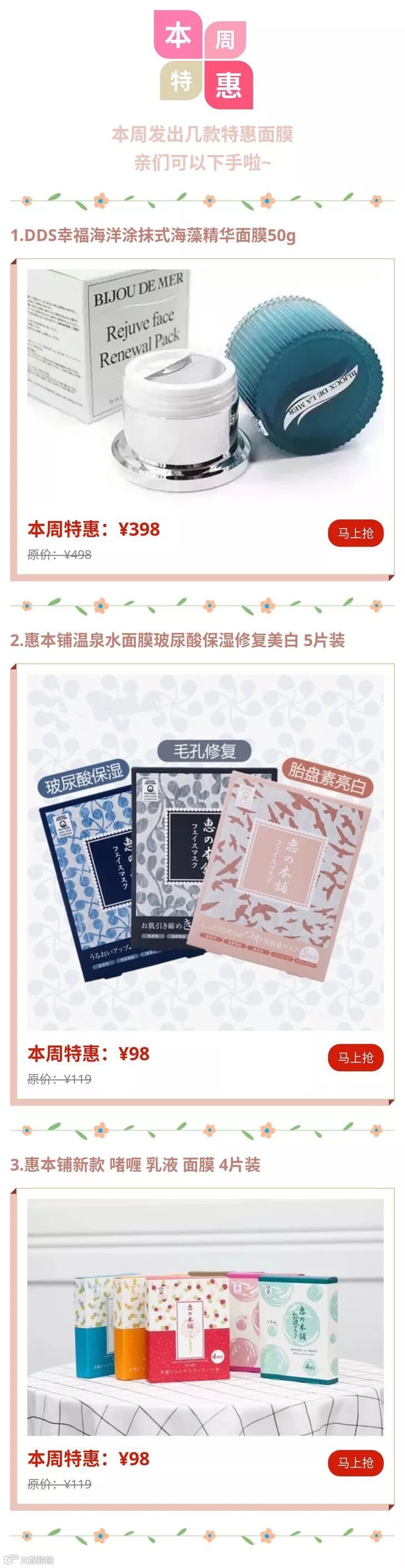 导读:DDS幸福海洋涂抹式海藻精华面膜 特惠398元 惠本铺温泉水 啫喱 乳液 九款面膜 特惠98元