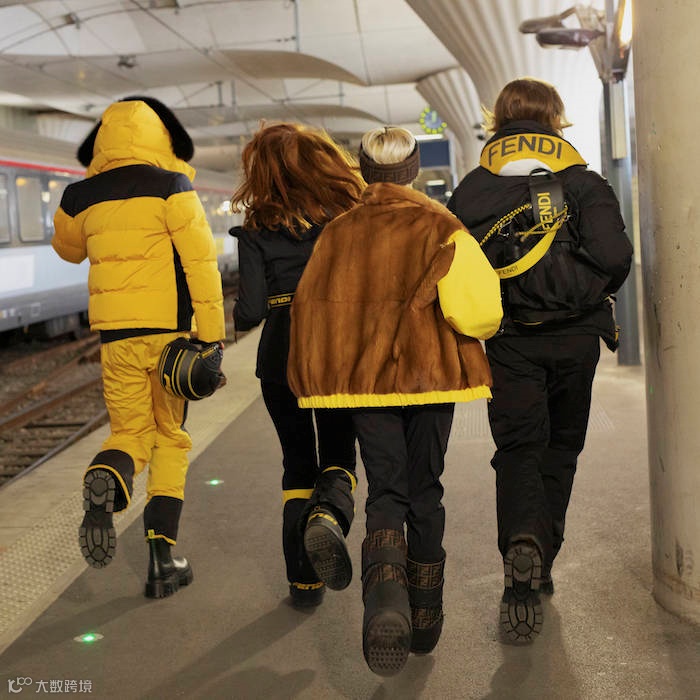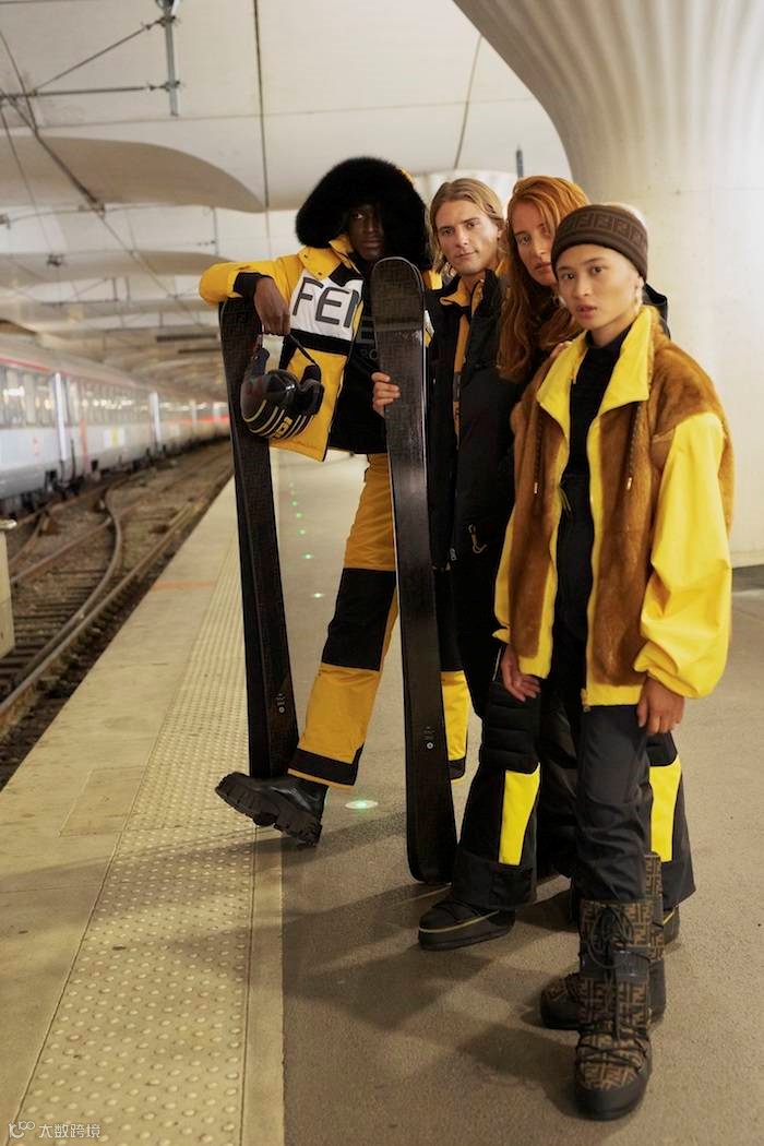 FENDI Roma logo在男装系列中占据了中心位置,打造出标志性的黄黑组合。FENDI 以品牌最受欢迎的外套款式为基础,设计了一系列高性能的棉服和夹克,采用无缝热力缝合和反光细节,搭配撞色滑雪裤和提花毛衣。