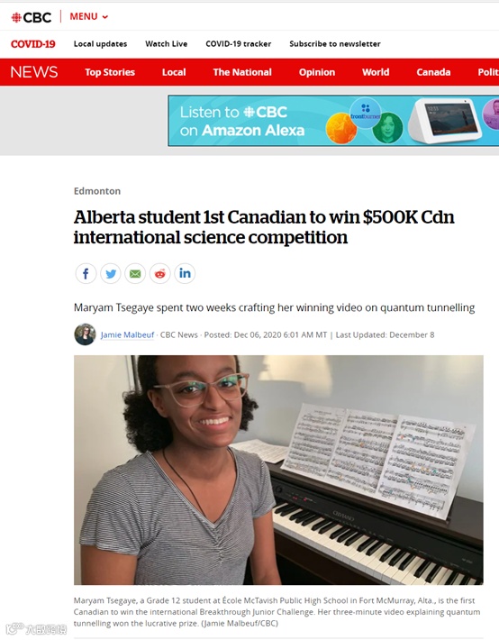 Maryam Tsegaye是艾伯塔省Fort McMurray市EcoleMc Tavish公立高中的一名12年级学生,她带着一段解释量子隧穿效应的三分钟视频参加了国际少年突破挑战赛(international Breakthrough Junior Challenge)。