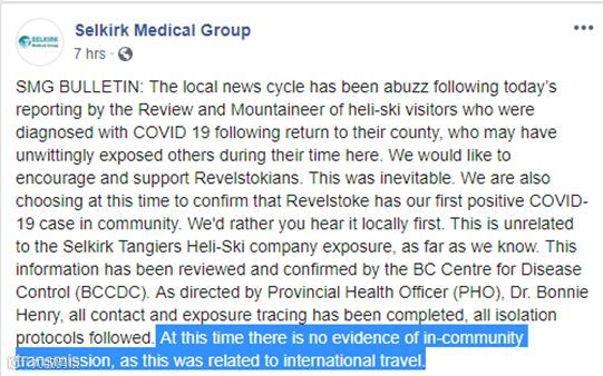 加拿大当地时间3月17日晚上8:45, Selkirk Medical Group确认,Revelstoke确诊首例新冠肺炎,已经由BC省疾控中心确认。