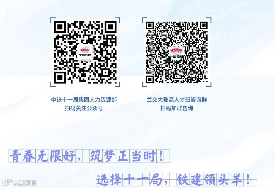 导读:中铁11局集团&兰州交通大学“杨连第登高人才定制班”正式启动了!青春无限好,逐梦正当时。选择十一局,成就心梦想!4月29日下午,相约兰州交大二教报告厅.......