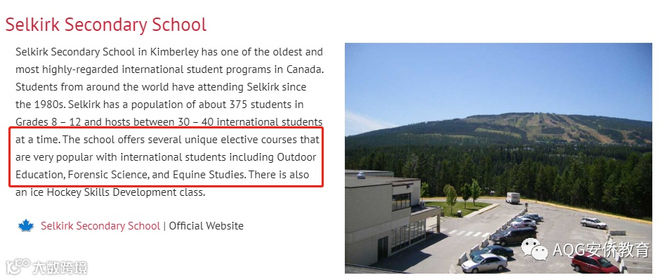 落基山教育局Selkirk Secondary School提供独一无二的选修课程,非常受国际学生欢迎,包括户外教育,法医科学等。