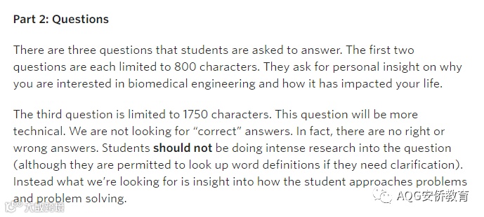 在申请进入Pre-Biomedical Engineering项目时,学生必须完成3道文书题:学生为什么对生物医学感兴趣,生物医学领域是如何影响学生的人生,以及一个技术性的研究问题: