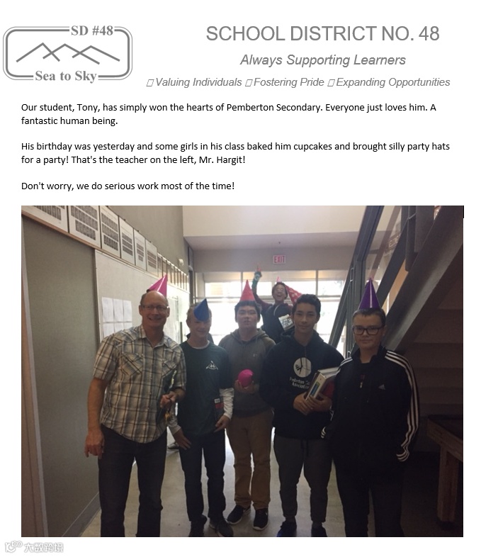 第二件事是我意外地发现学校的里的老师同学们都对我非常友好。我在中国时常常被人视作“差生”,而在我的理解里,这些不是一个“差生”应有的待遇,在Pemberton中学我简直就像“大熊猫”。举个例子,在我生日的时候,全校一起帮我庆祝生日,无论老师同学,每一个人都戴上了生日帽,走廊上每一个走过我身边的人都祝贺我;学校还给我准备了生日蛋糕,让我和班级的同学一起分享。
