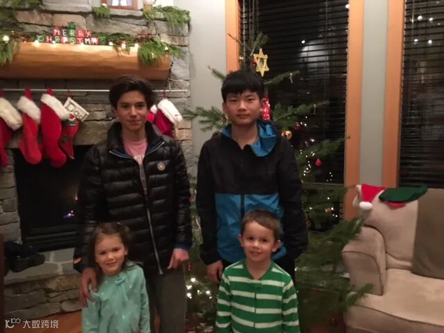 海天教育局老师Brianne Aldcroft邀请Tony及住宿家庭孩子圣诞聚餐(西班牙留学生Ernesto, Tony, 住宿家庭女儿Maria, 教育局老师的儿子Evan)