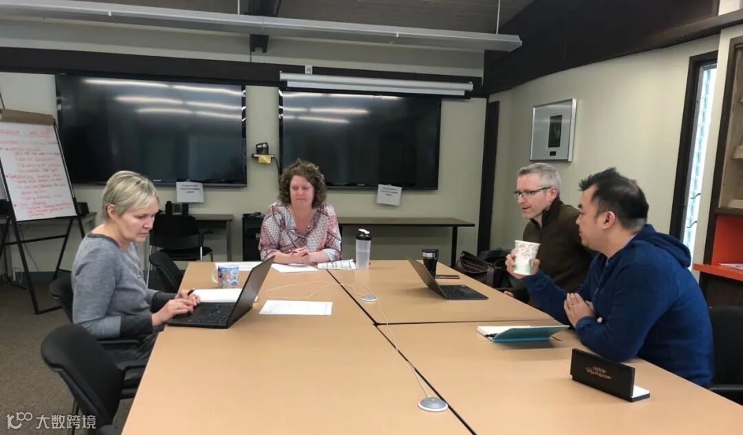 AQG顾问Arthur(右一)与前海天教育局国际部负责人、现落基山国际教育项目负责人Amy Shoup(左一);前落基山国际教育项目负责人、现珀塞尔国际教育总裁Duncan MacLeod(右二);落基山国际教育项目南区负责人Ulli Murtagh(左二)讨论Tony学业及生活支持