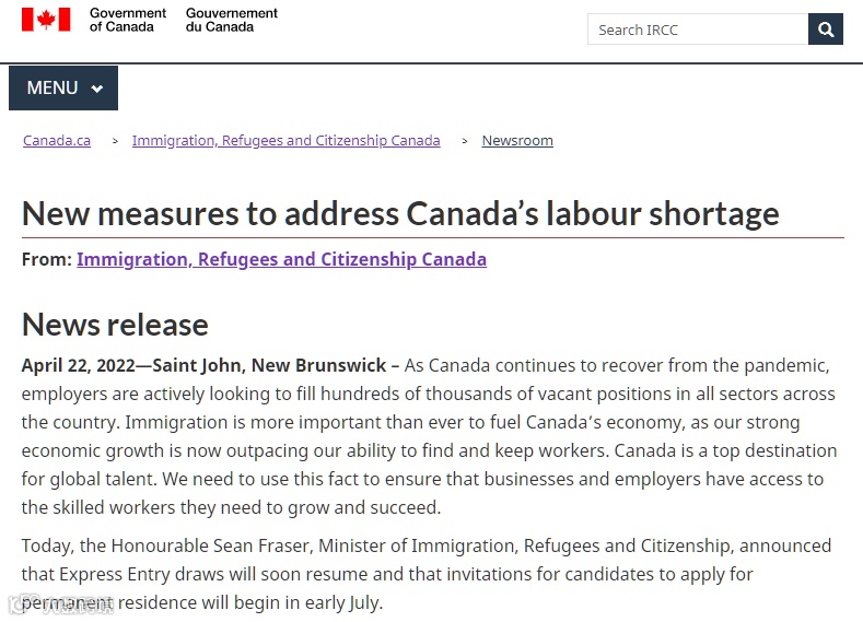 2022年4月22日,加拿大移民、难民和公民事务部部长肖恩·弗雷泽(Sean Fraser)宣布,Express Entry快速入境移民将很快恢复,并将于7月初开始邀请候选人申请永久居留权。