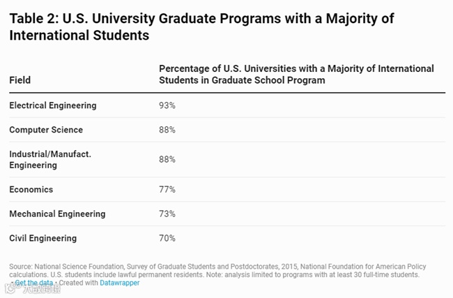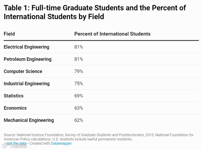 该研究指出,在电气工程和石油工程专业的全日制研究生中,有81%是国际生,79%是计算机科学专业,75%是工业工程专业,69%是统计学专业,63%是经济学专业,62%是机械工程专业,59%是土木工程专业,57%是化学工程专业。