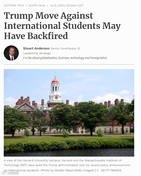 “周一没有通知就公布了政策,同一天哈佛宣布,经过多个部门的努力,今年秋季所有本科课程将转为在线课程,但政策政府迫使大学重开面授教学,”Karin Fischer在高等教育纪事报报道。(这也符合鼓励外国人离开美国的管理模式)
