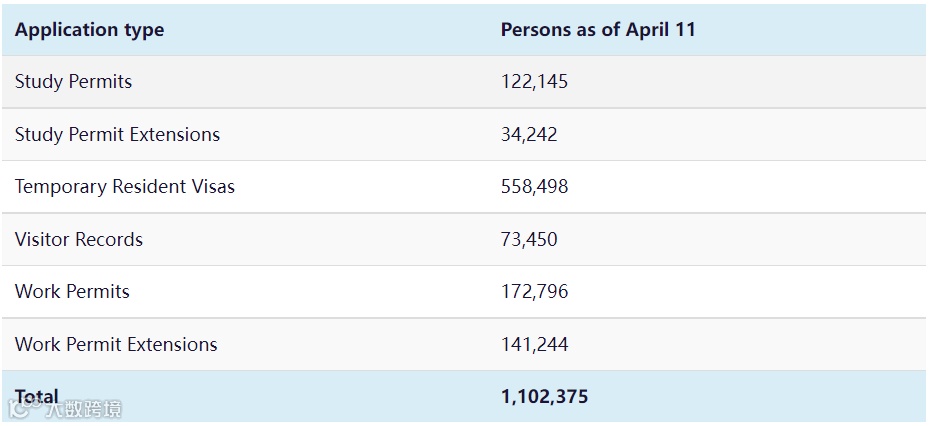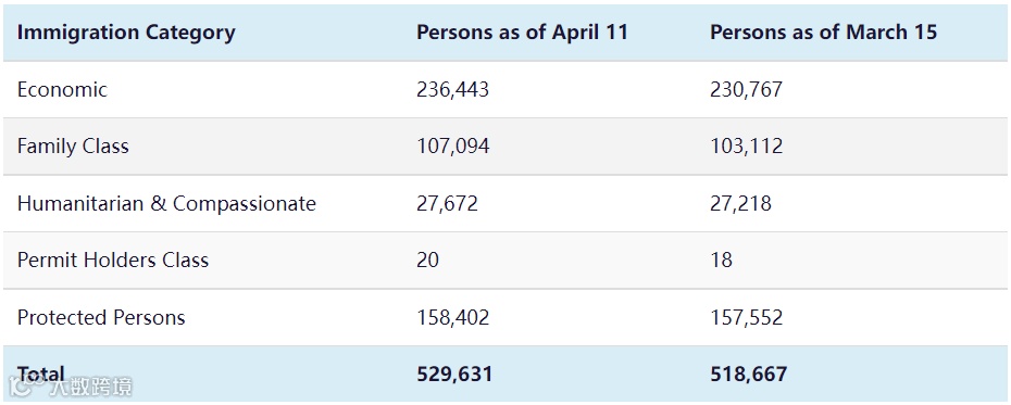 截至4月11日,永久居民申请积压量为53万人,比3月份的51.9万人略有增加。所有类别的永久居民申请积压量都有所增加。