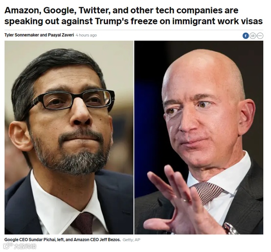 包括亚马逊、优步、谷歌母公司Alphabet和推特在内的主要科技公司周一谴责了特朗普总统冻结一系列移民工作签证的做法,称这是“难以置信的糟糕政策”,将损害美国的经济复苏及其竞争力。