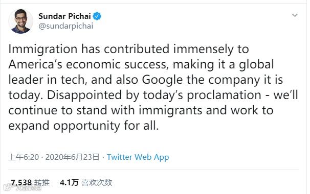 Alphabet首席执行官Sundar Pichai本人也是移民,他周一在推特上表达了对该命令的反对,他说:“移民为美国的经济成功做出了巨大贡献,使美国成为全球科技领袖,也就是今天的谷歌公司。”