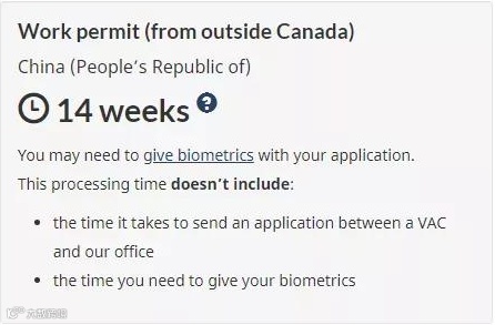 中国递交申请加拿大工作签证需要14weeks(98天)。