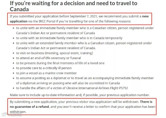 如果申请人正在等待审批,且依然需要前往加拿大,您在2021年9月7日之前提交了申请,如果您出于以下原因之一想前往加拿大旅行,我们建议您提交一份新申请: