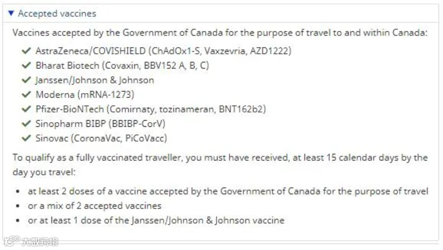 必须在进入加拿大前至少15天前完成了第二剂疫苗接种;