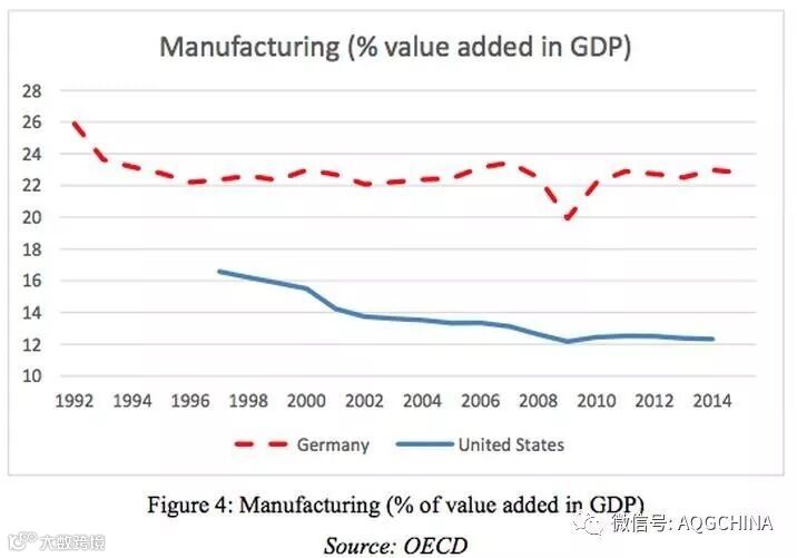 尽管美国和德国的制造业因2008年全球金融危机而受到冲击,但德国制造业已经复苏,而美国则没有。