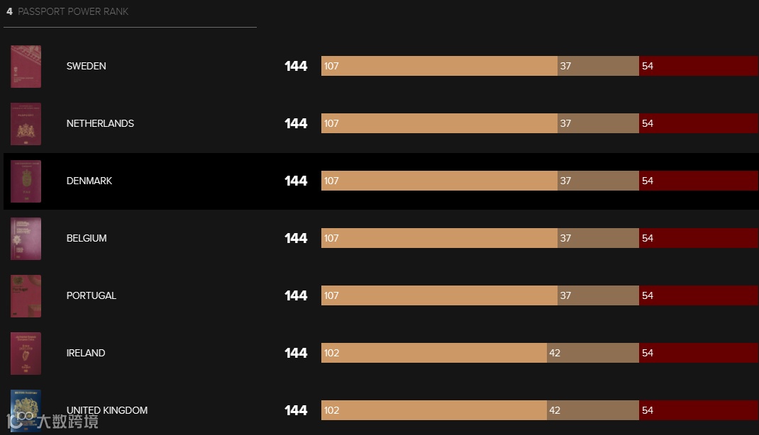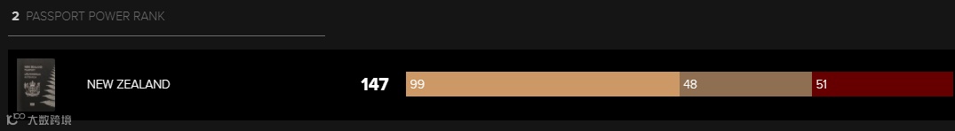 护照以147个免签及落地签国家紧随其后排在第二名。